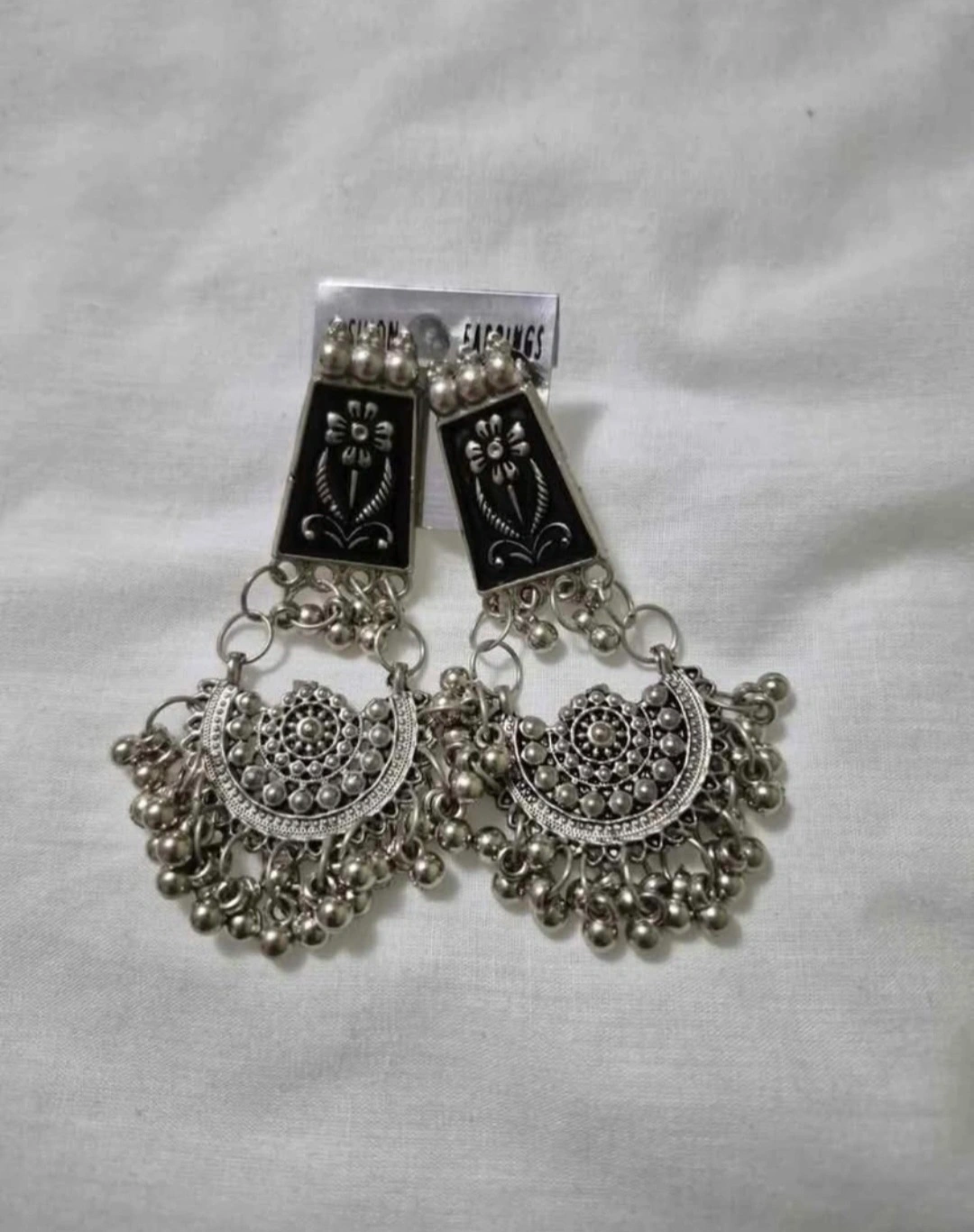 18Beautiful dangle earrings with intricate detailing. These earrings feature a unique design with floral patterns and small silver beads, perfect for adding a touch of elegance to any outfit