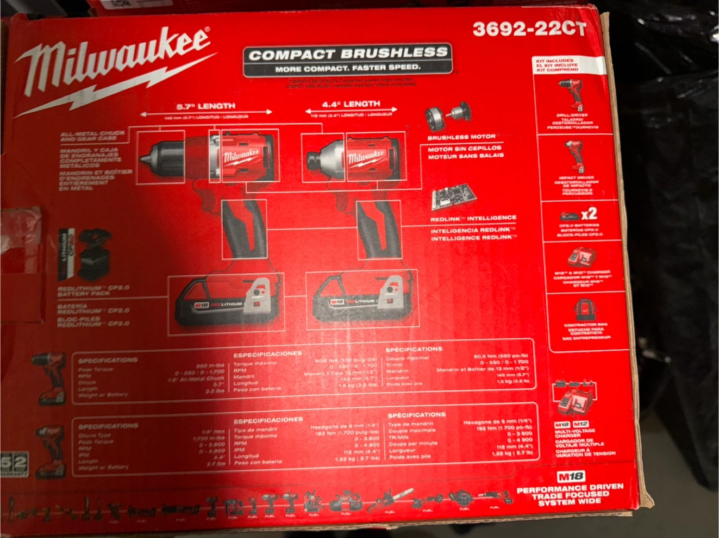 This is the Milwaukee 3692-22CT cordless compact brushless drill/impact combo kit. It includes two batteries, a charger, and a carrying bag.