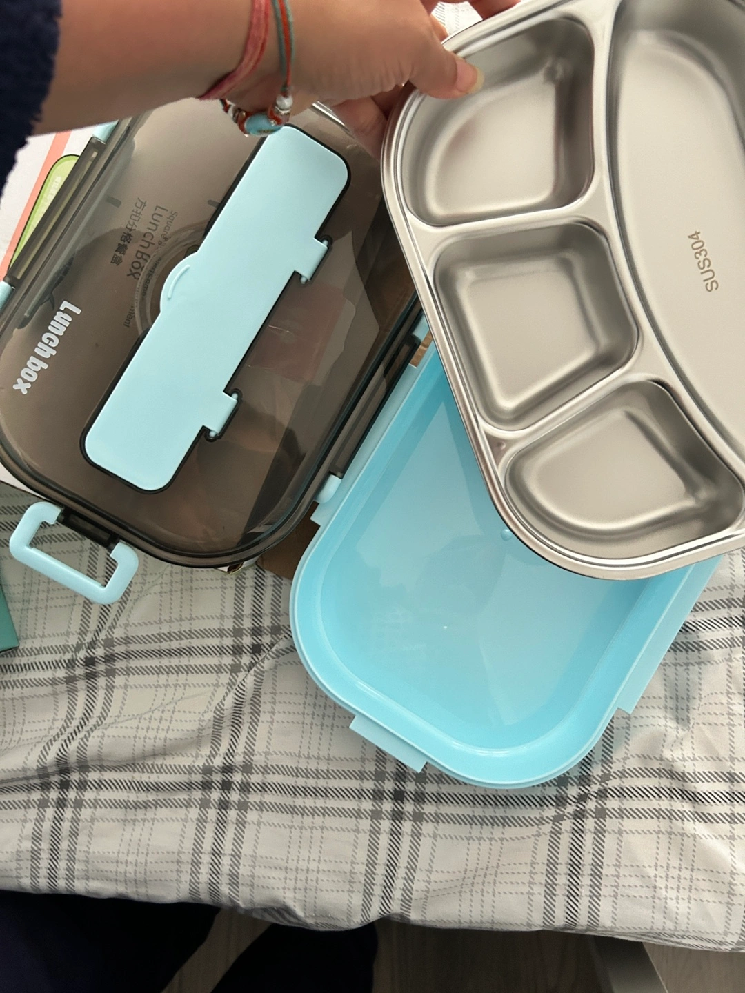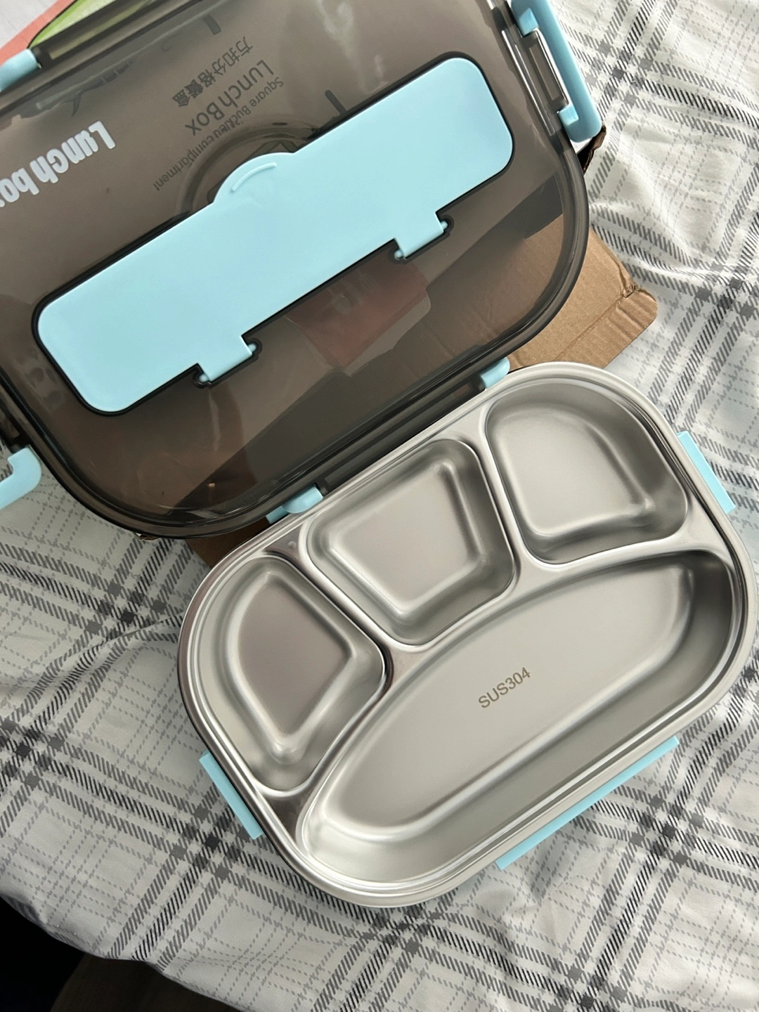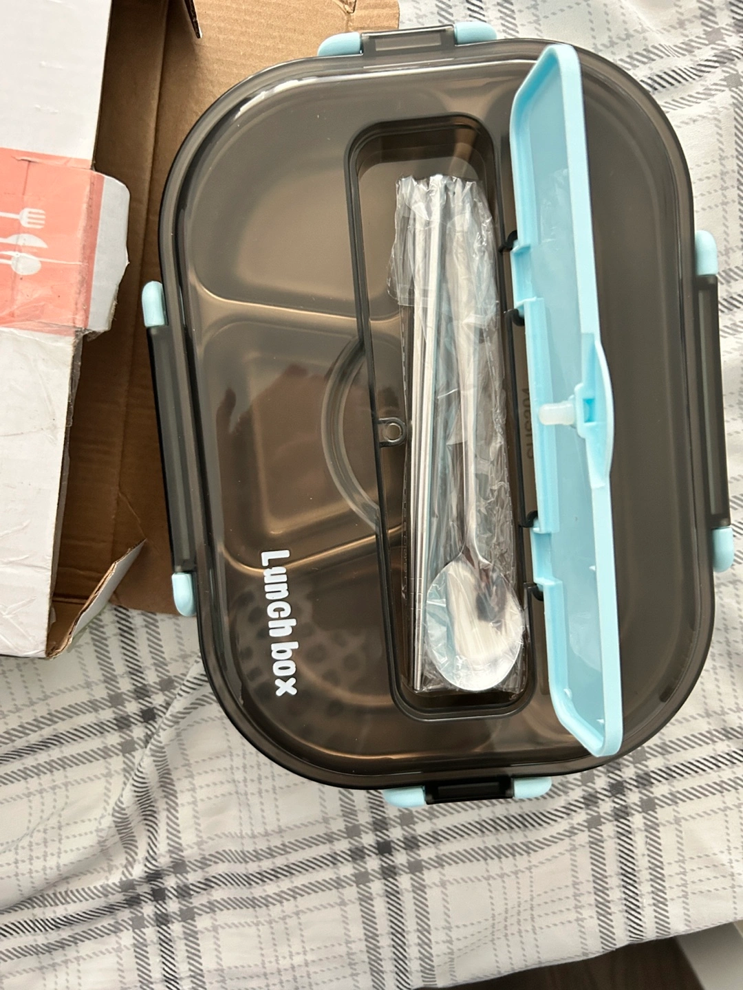 New lunch box with a stainless steel tray divided into four sections. Includes a lid and a set of cutlery.