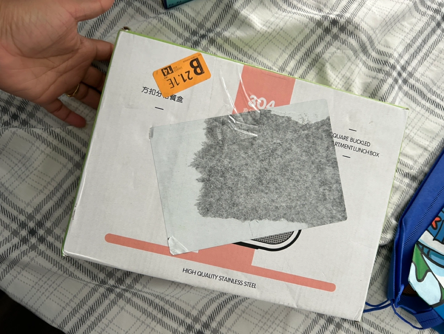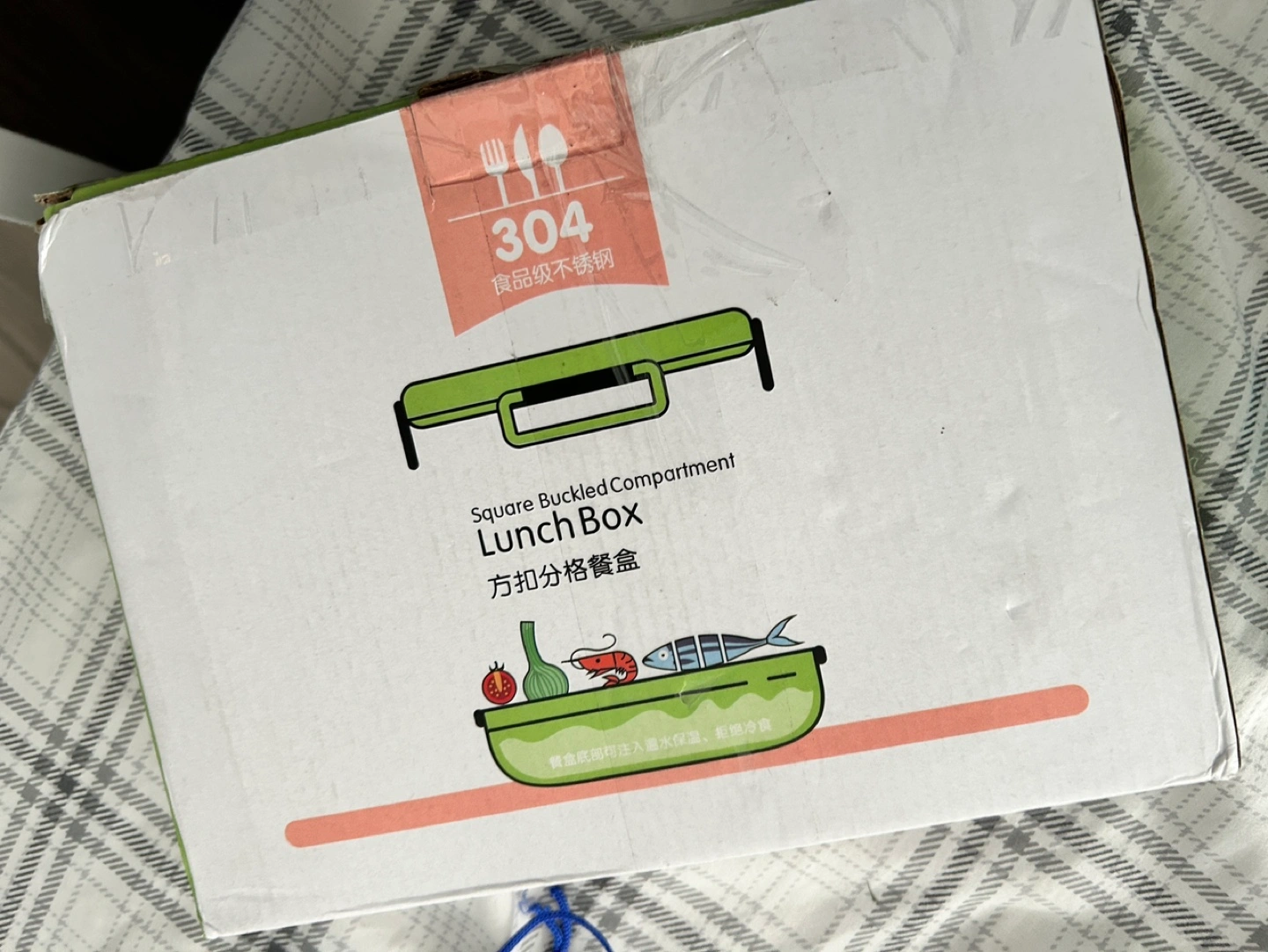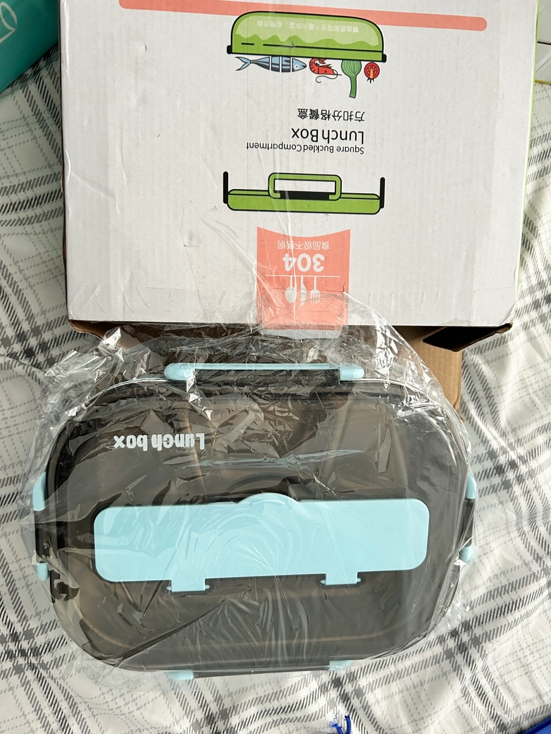 New lunch box with a stainless steel tray divided into four sections. Includes a lid and a set of cutlery.