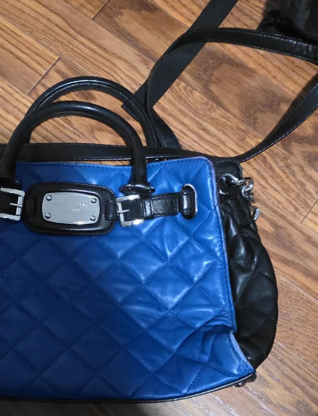Michael Kors satchel handbag. Features quilted blue and black leather. Includes top handles and a detachable shoulder strap.