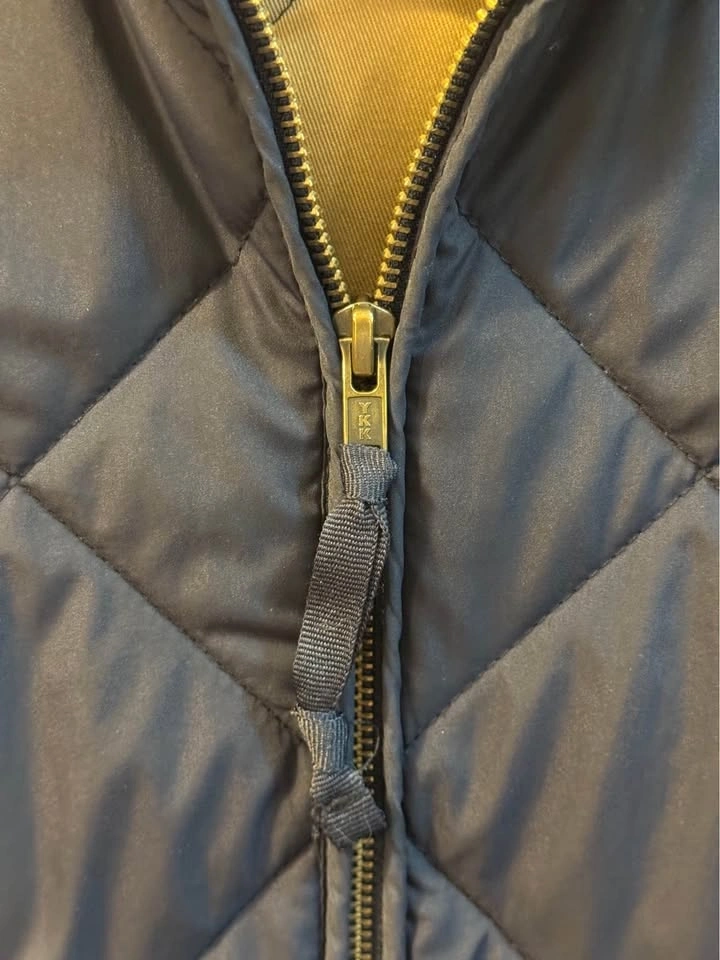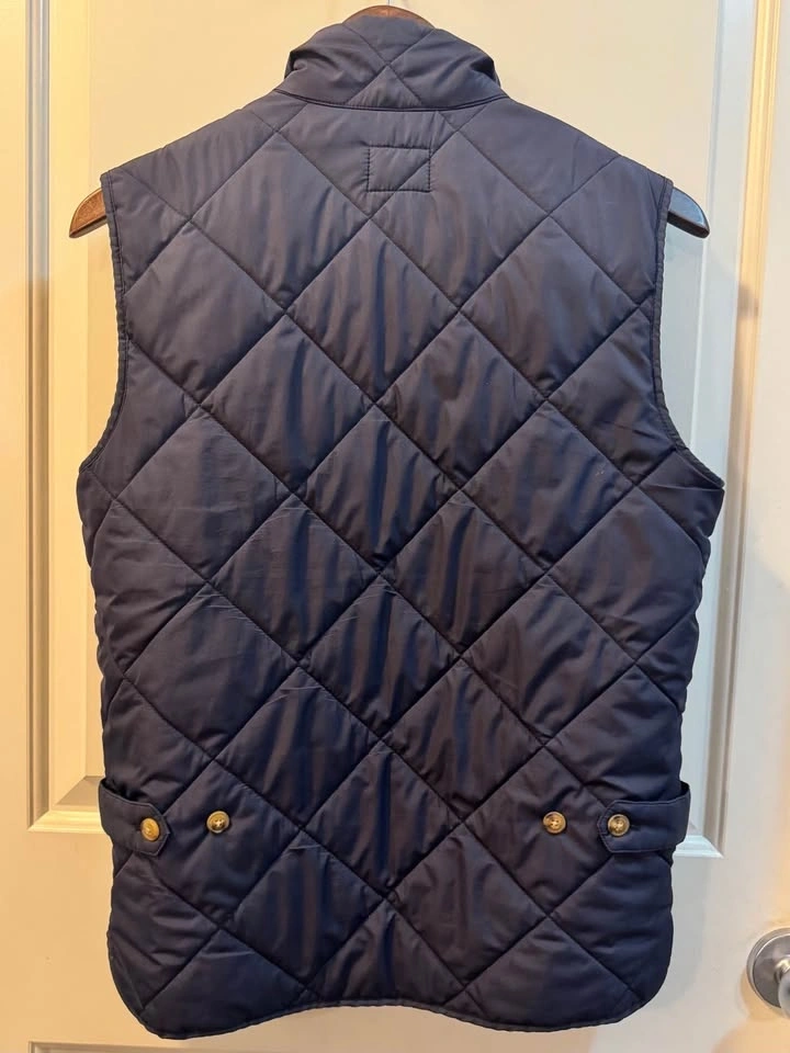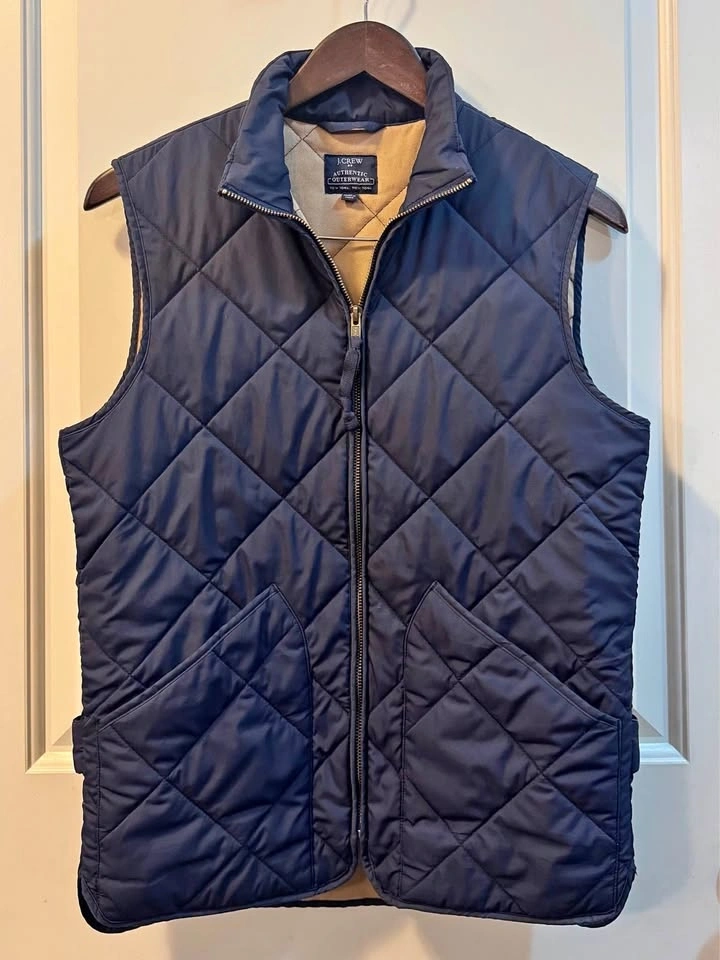J.Crew Authentic Outerwear Quilted "Walker" Vest in Navy Blue with a contrast Tan/Khaki lining. Classic diamond-quilted shell for a timeless, preppy look. Features a full-zip front with a YKK brass-tone zipper and ribbon pull, two angled front hand pockets, and adjustable button tabs on the back for a tailored fit. Lightweight but warm, perfect for layering. Excellent pre-owned condition.