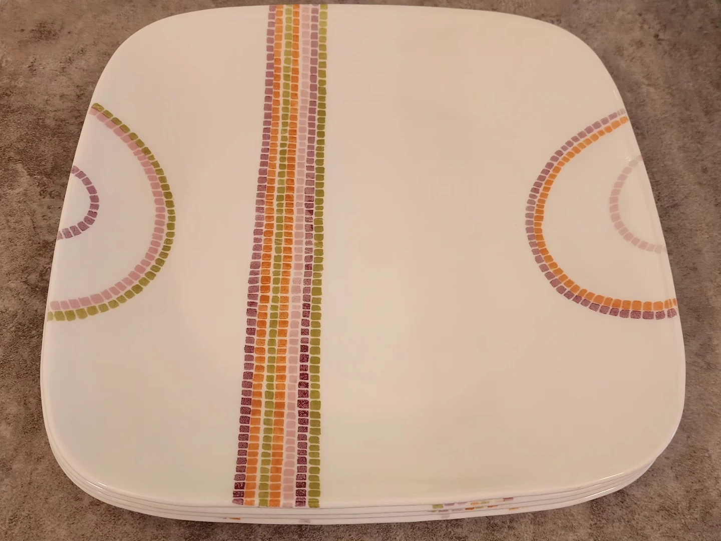 Set of four Corelle square dinner plates featuring a colourful mosaic stripe design. These durable plates are made from tempered glass for long-lasting use. Dishwasher and microwave safe. Great for everyday meals or entertaining!