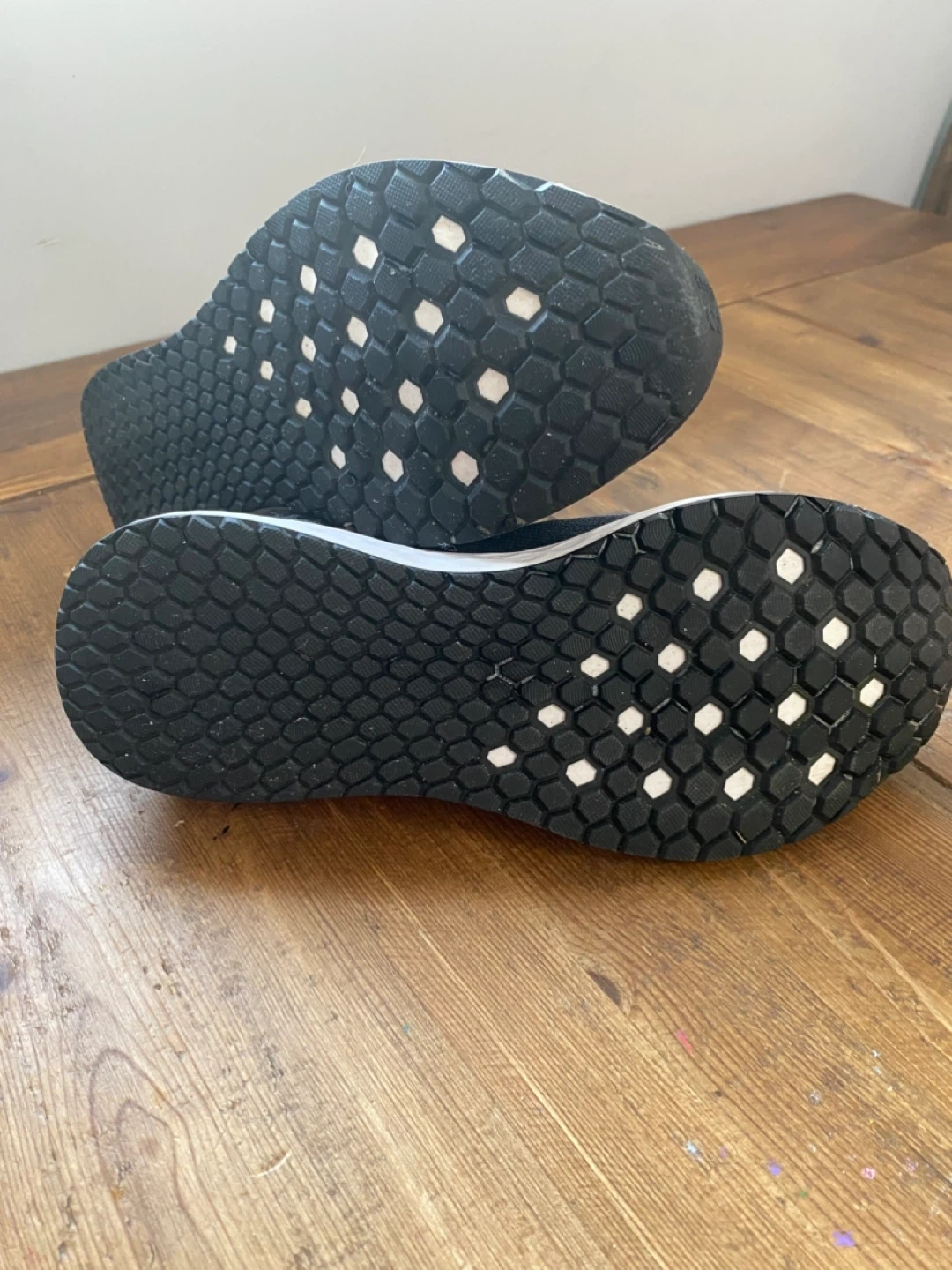 These black New Balance running shoes feature rose gold accents and Fresh Foam technology for comfort. The mesh upper offers breathability. They're suitable for road running or everyday wear.