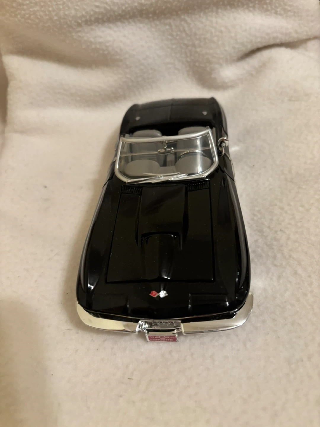 This is a vintage black, die-cast 1967 convertible corvette toy car. It has chrome accents and detailed interior. Great for collectors. 1:24 I have two in black one in red listed separately each are $40 I have the motor max box that held four I only have three who ever buys all three can have the box