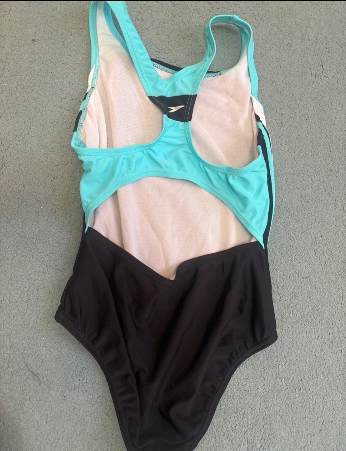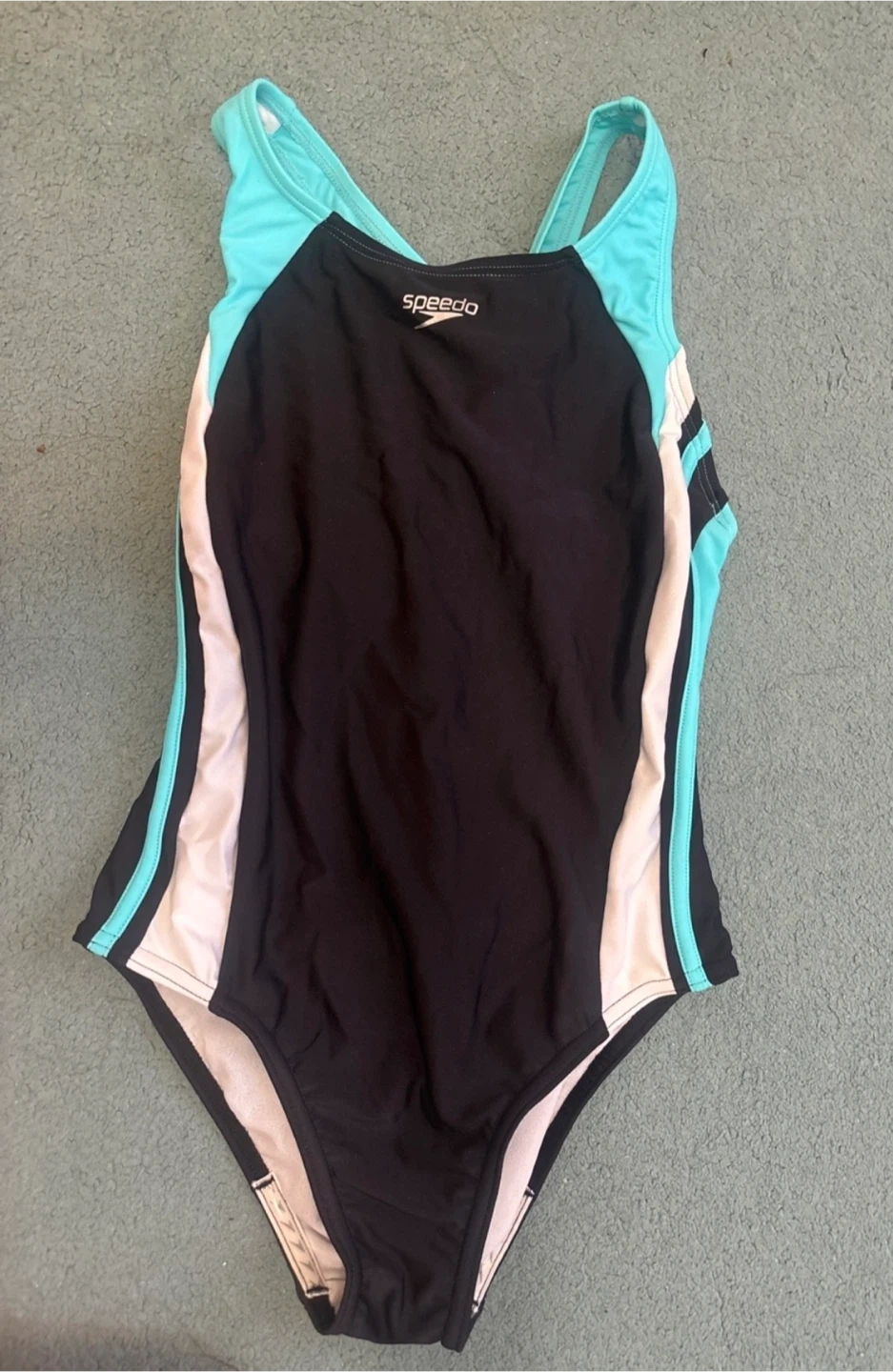 This Speedo girls swimsuit is great for swimming lessons or casual pool days. It's black with turquoise and white accents.Fits girls 12-14. Brand new without tags.