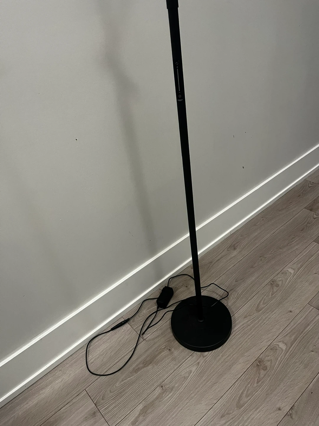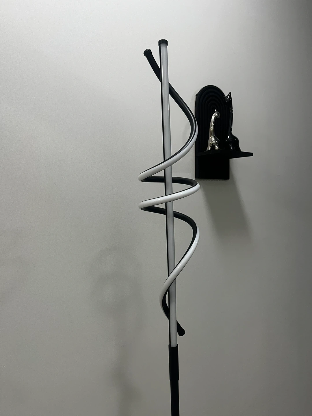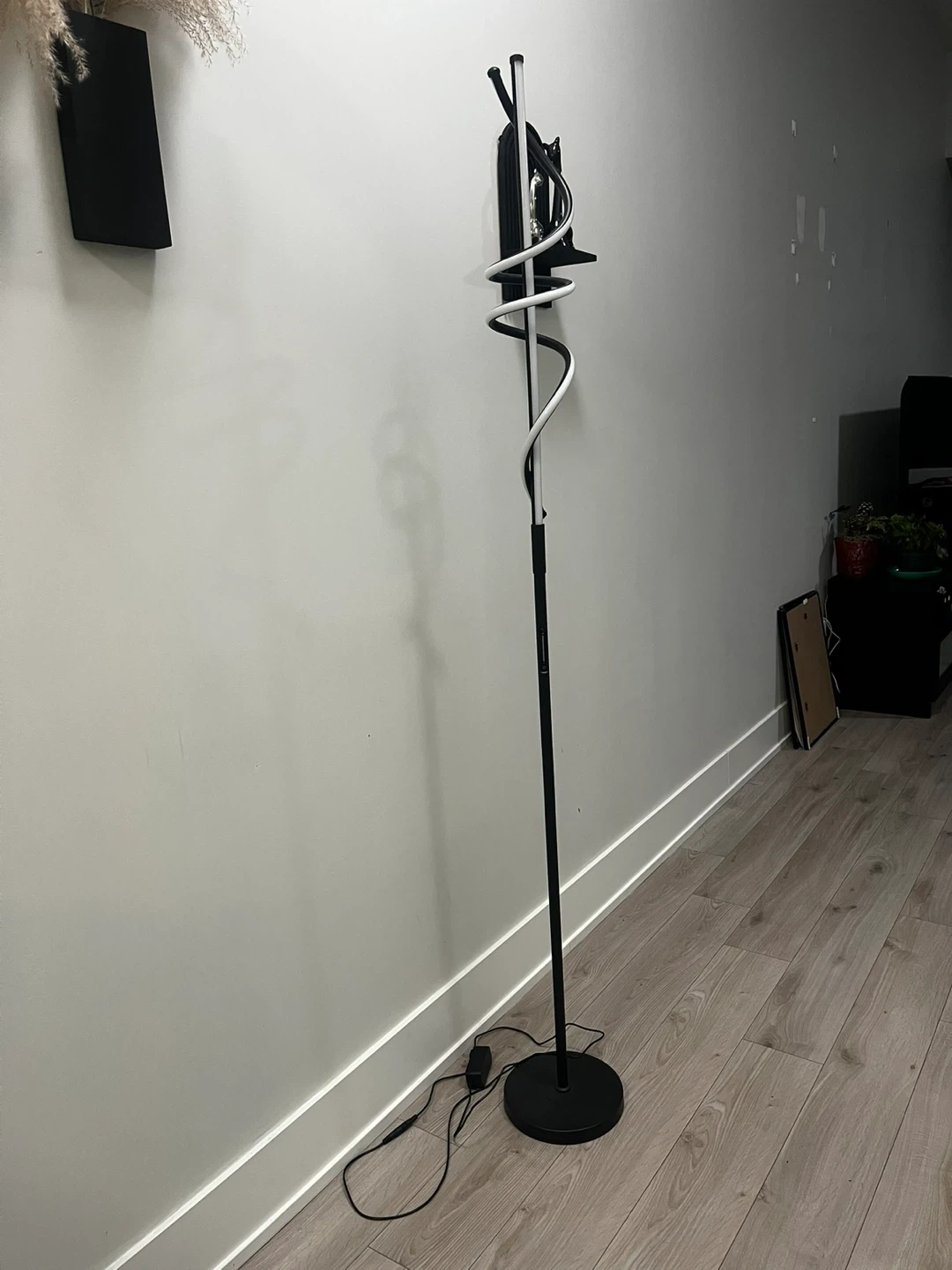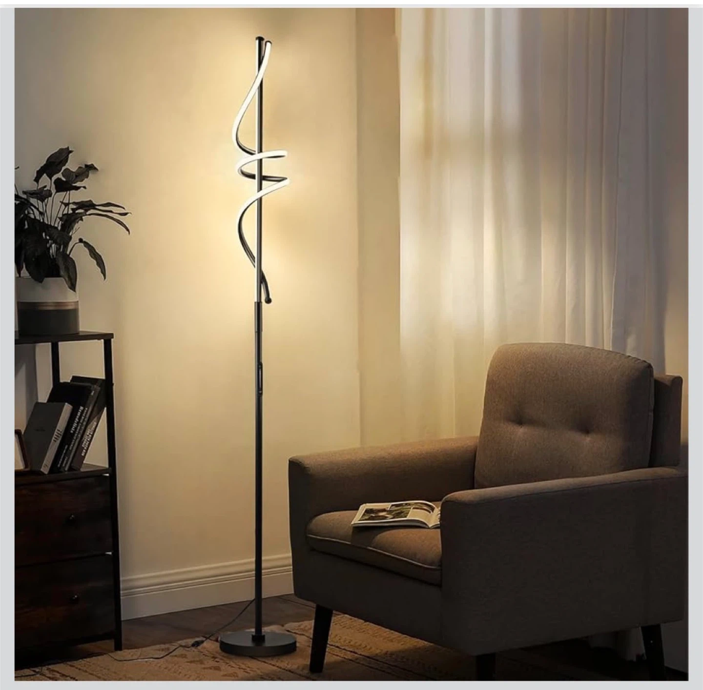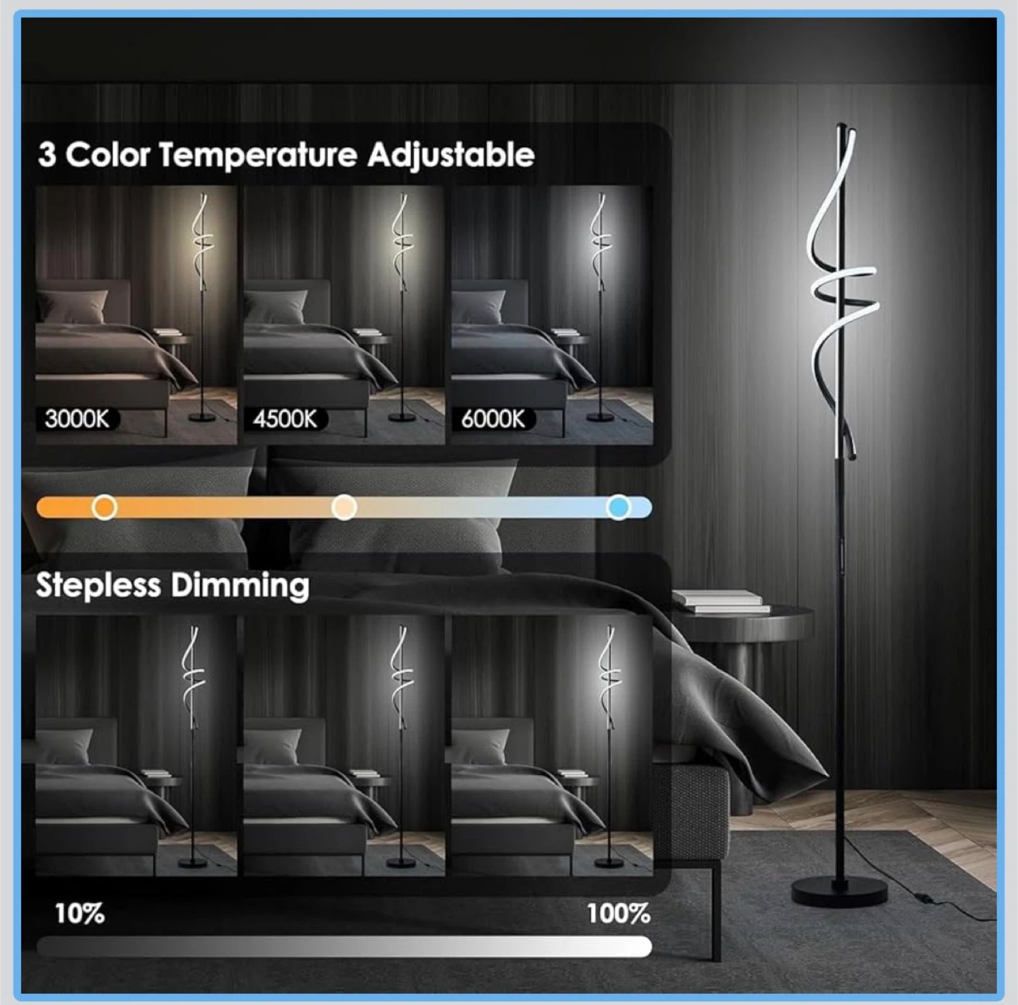 This modern floor lamp features a unique spiral design and provides 48W bright LED lighting. It offers 3 color temperatures (3000K, 4500K, 6000K) and stepless dimming, all controllable via touch or remote. The lamp has a weighted base for stability. It's perfect for adding ambient lighting to any room.