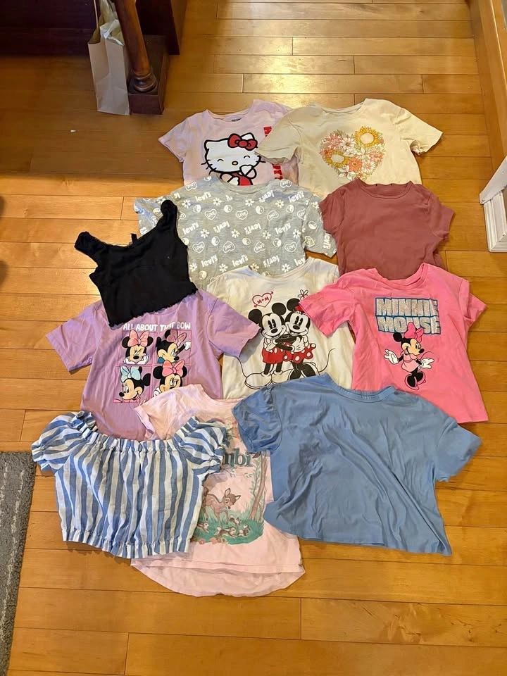 Set of 11 good condition girls tees. All sizes are a kids Large or 10-12 with the exception of pink Minnie which is 7-8 and the white Minnie which is XL 12-14. Pick up south end Guelph.