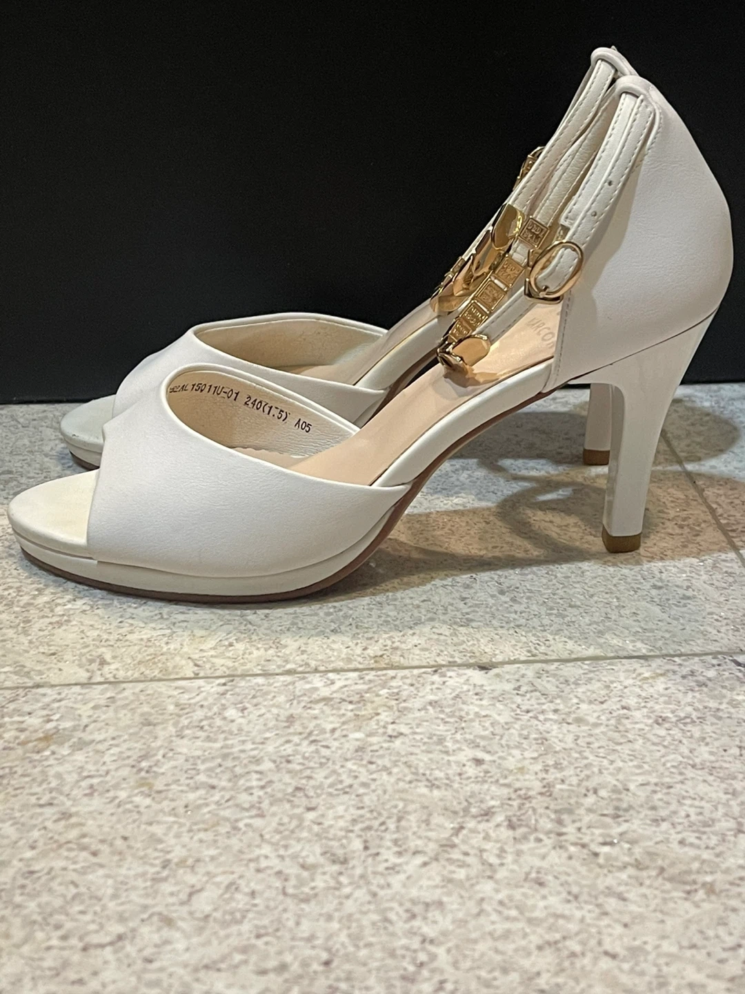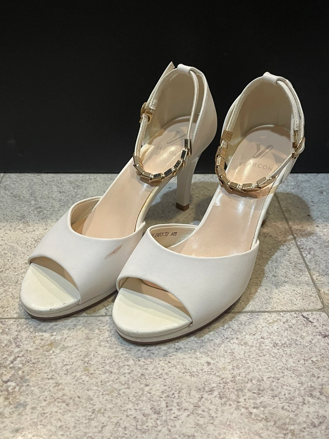 White peep-toe heels. Features an ankle strap with decorative gold chain links. Heel height is approximately 3 inches.