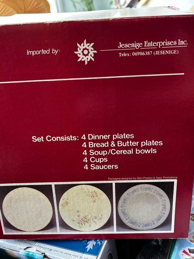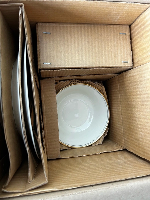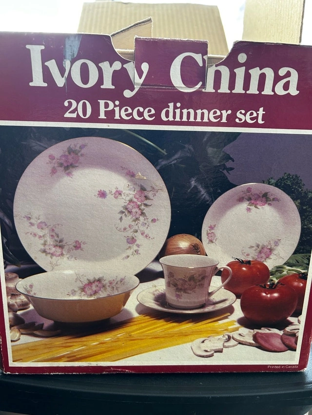 Beautiful 20-piece vintage Ivory China dinnerware set, service for 4. This set features a classic, elegant design with delicate gold-rimmed edges on a cream-colored porcelain base. Perfect for holiday hosting, special occasions, or as a timeless wedding/housewarming gift. Set Includes: 4 Dinner Plates, 4 Salad/Bread Plates, 4 Soup/Cereal Bowls, 4 Tea/Coffee Cups, 4 Saucers. Details: Material: Fine Ivory China. Design: Classic gold band trim. Origin: Made in China (Imported by Jesenige Enterprises). Care: Hand wash recommended to preserve the gold gilding. Cashless payment and cash accepted.