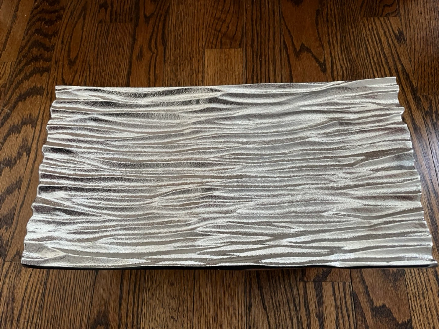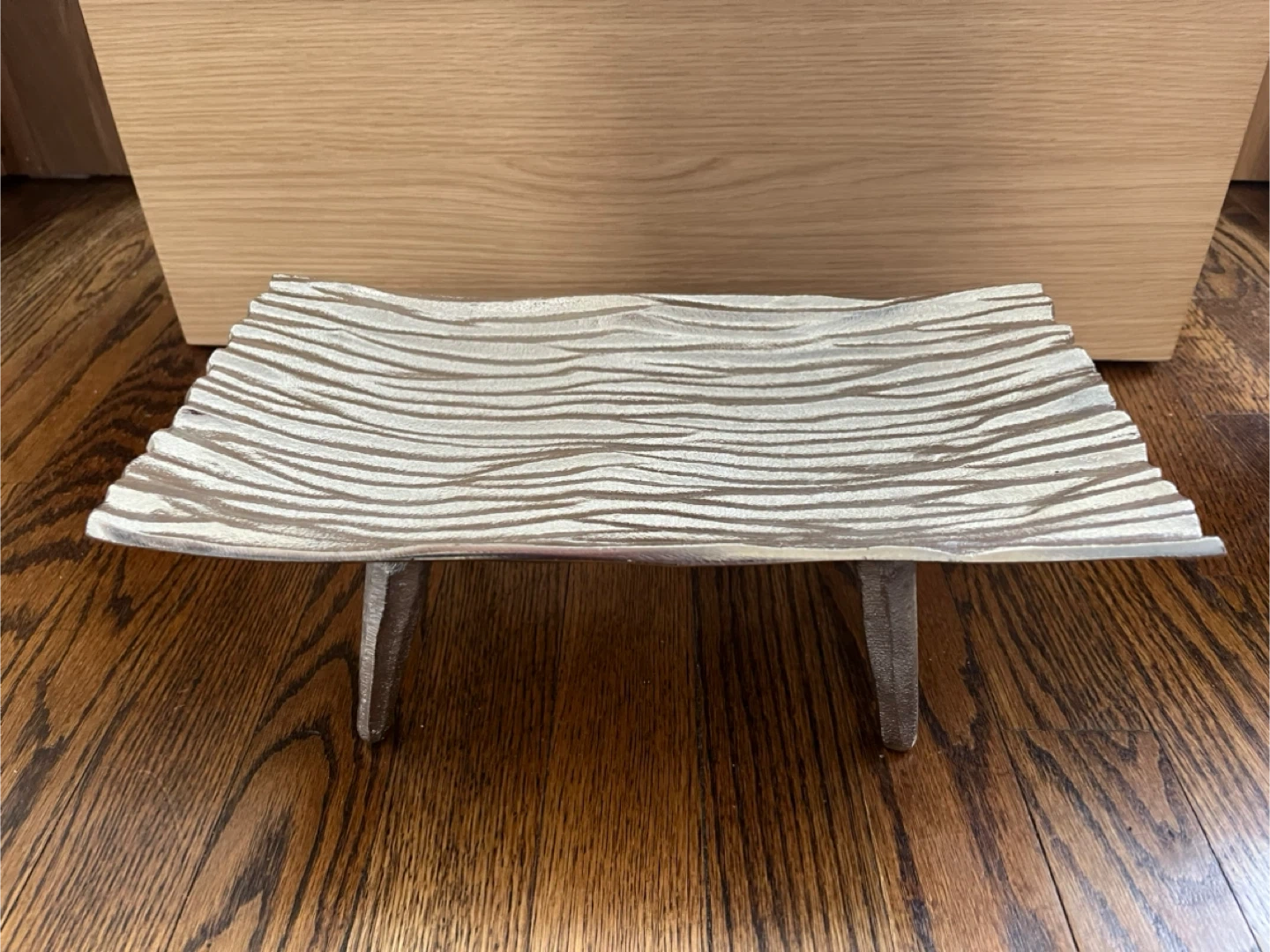 This decorative tray features a textured, wavy surface with raised edges and four sturdy feet. It's finished in a metallic silver colour. Perfect for serving appetizers or displaying small items!