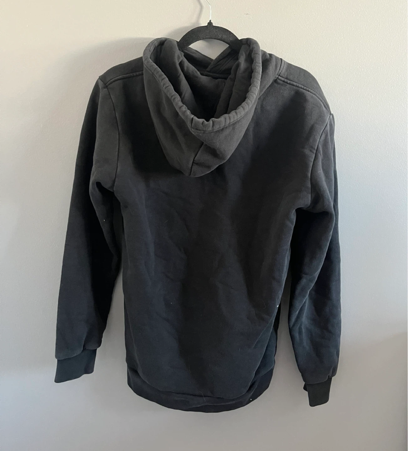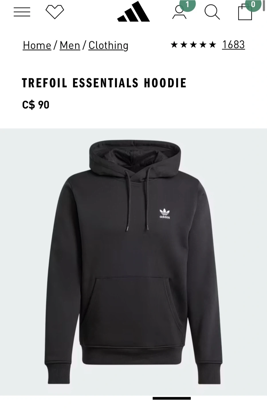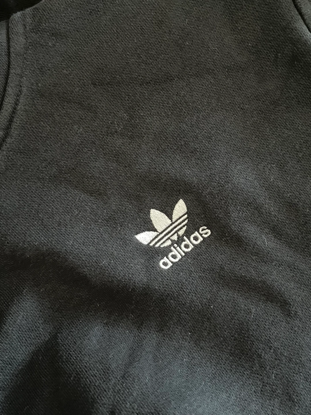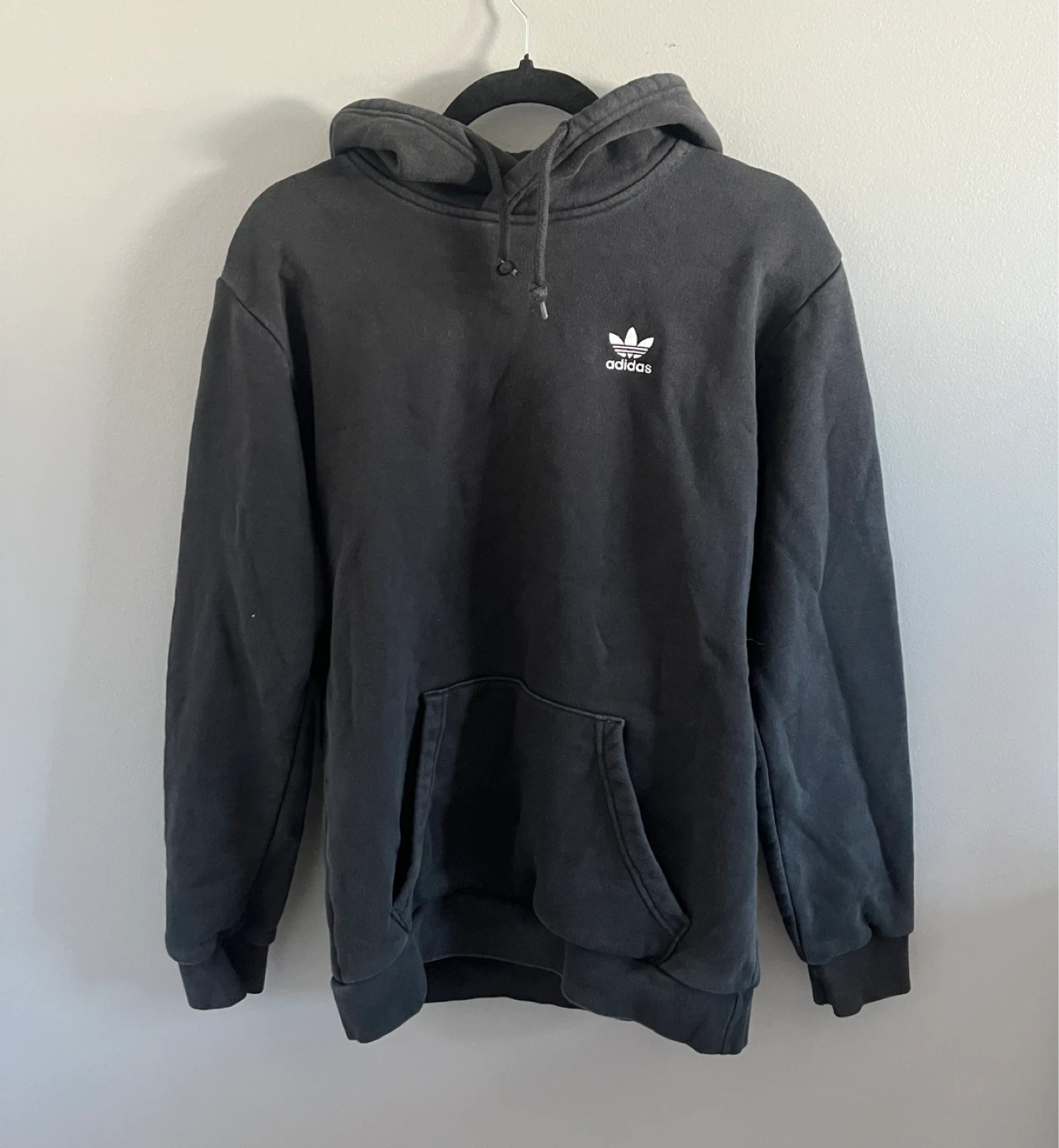 Classic Adidas hoodie in black. Features Adidas logo on chest and front pocket. Comfortable and casual.
