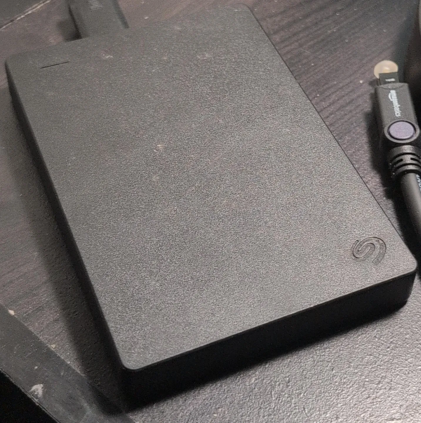 This is a black 2Tb Seagate portable external hard drive. It's made of plastic. It's great for extra storage on your computer!
