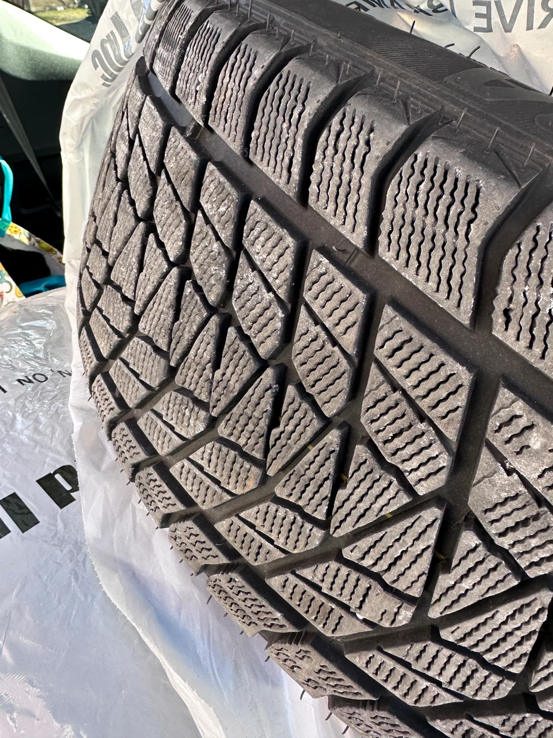 Four winter tire and wheel assembly. The tire size is 275/45R20. It's a black alloy wheel with the Porsche crest center cap. This is a winter tire for cold weather driving!