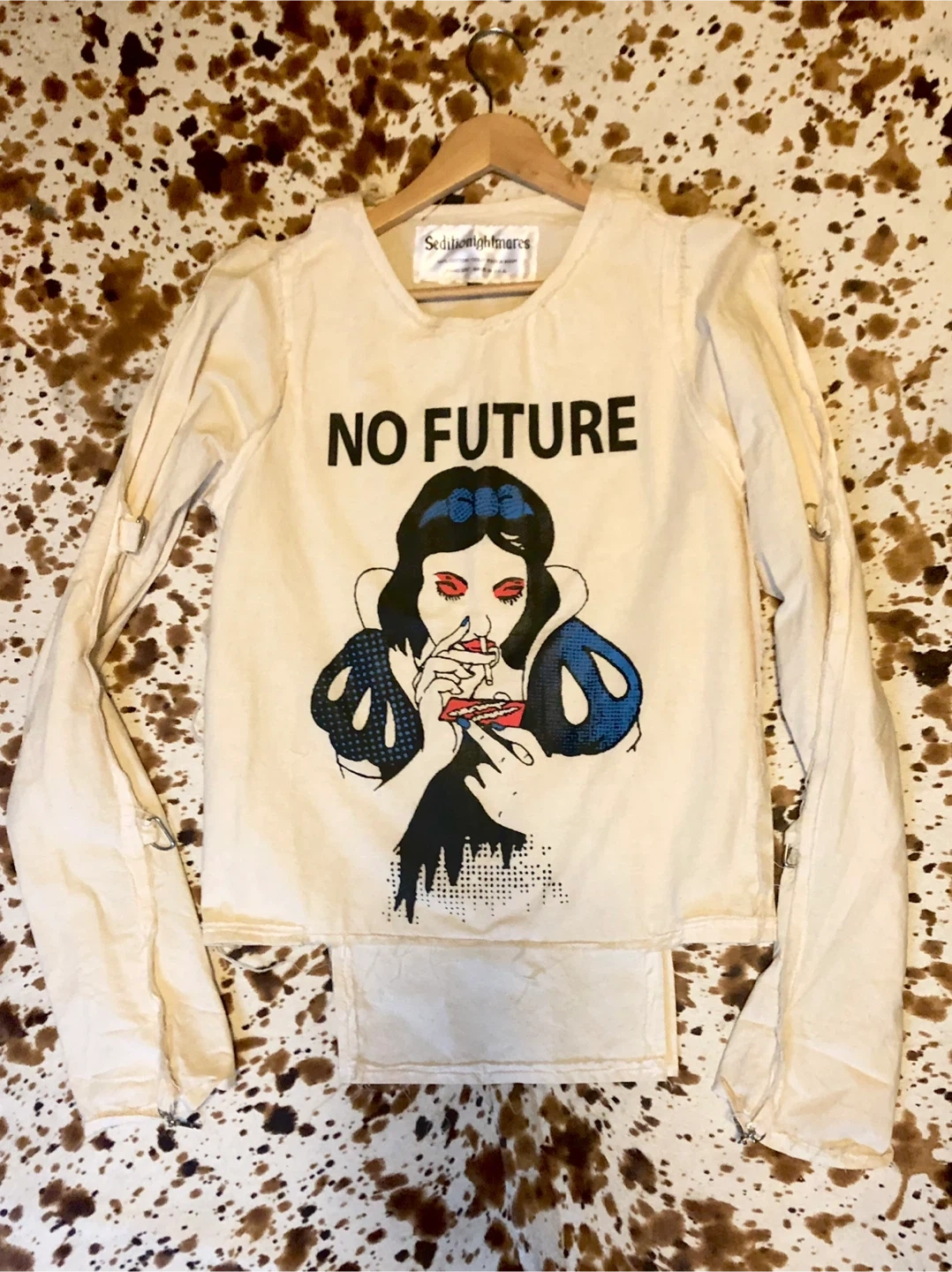 This is a graphic Punk rock bondage long sleeve shirt with a "NO FUTURE" print featuring Snow White. It's a unique piece with distressed details and metal D ring accents on the shoulders and sleeves. The material appears to be cotton.
