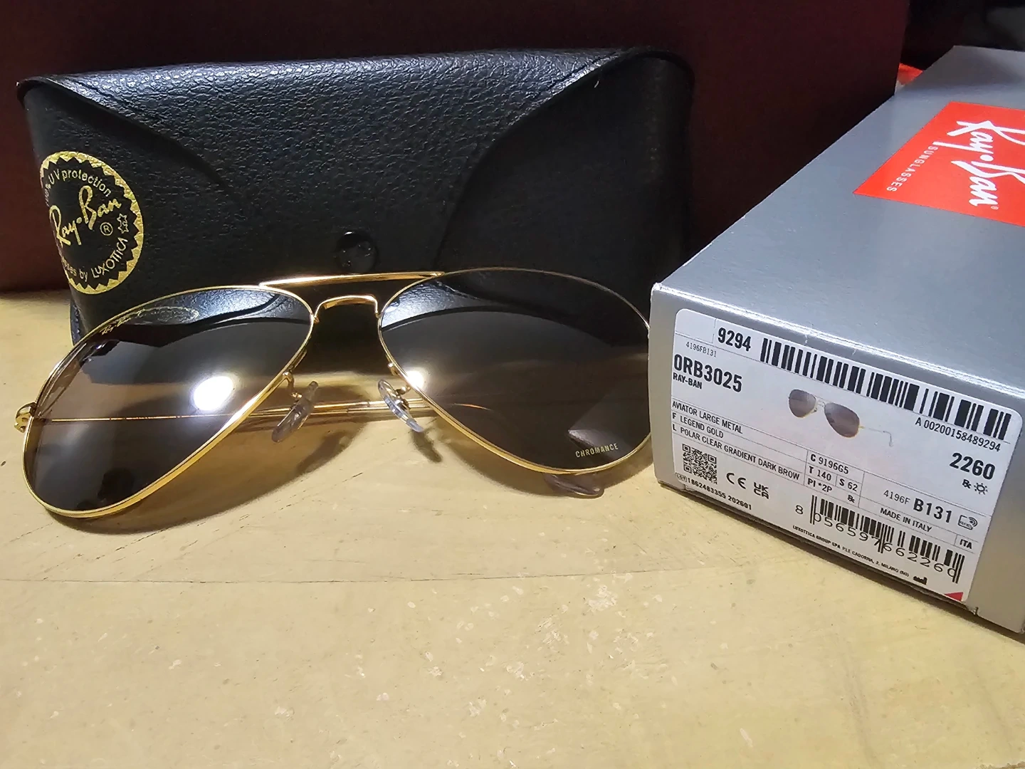 New Ray-Ban Gold on Dark Brown Aviator Sunglasses RB3025 58mm