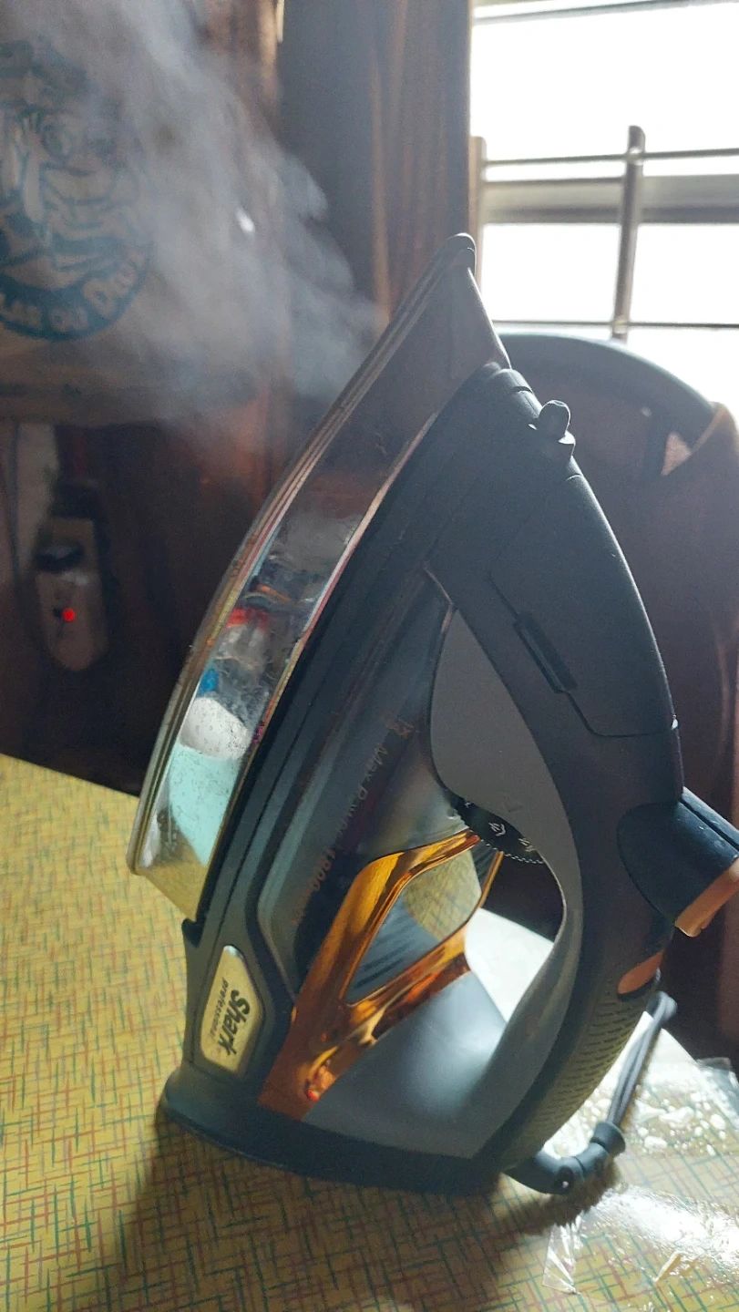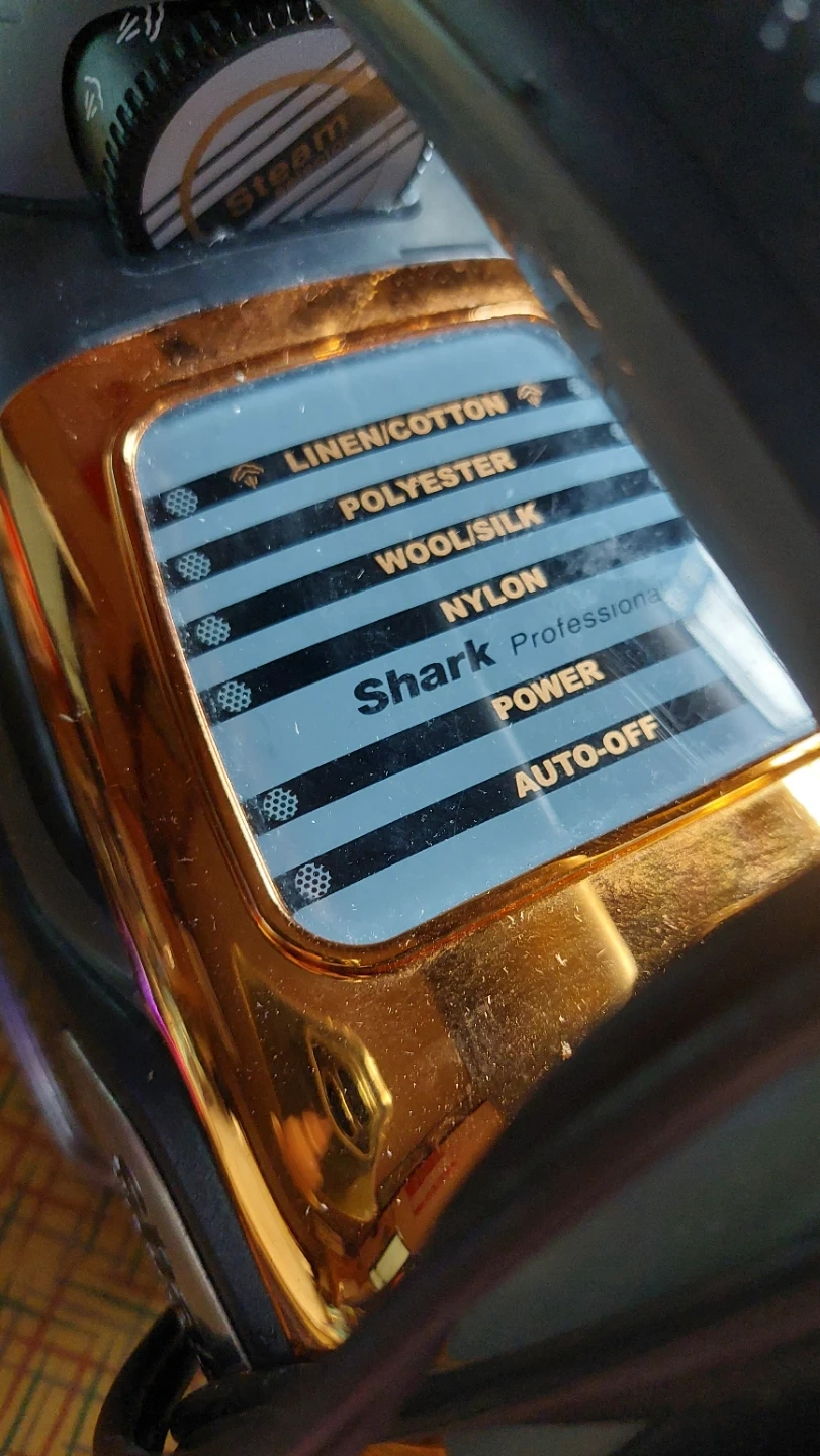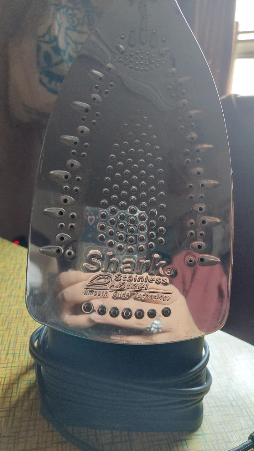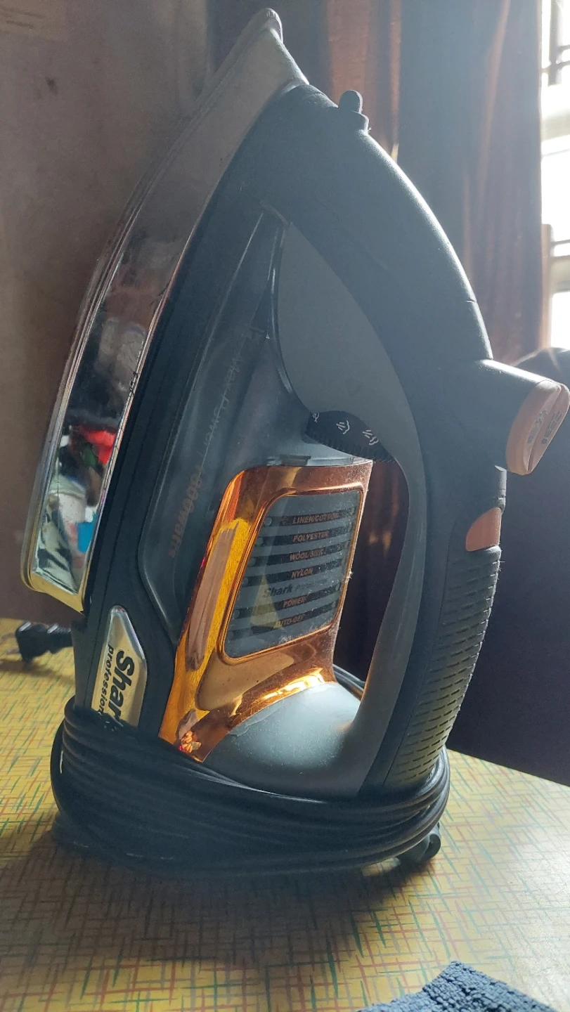 Working, well loved, Shark Professional steam iron with "Smooth Glide Technology". It has settings for Linen/Cotton, Polyester, Wool/Silk, and Nylon. Features auto-shut off power settings, self cleaning, vertical steam, steam burst function, non-stick, anti-drip, adjustable temp control.