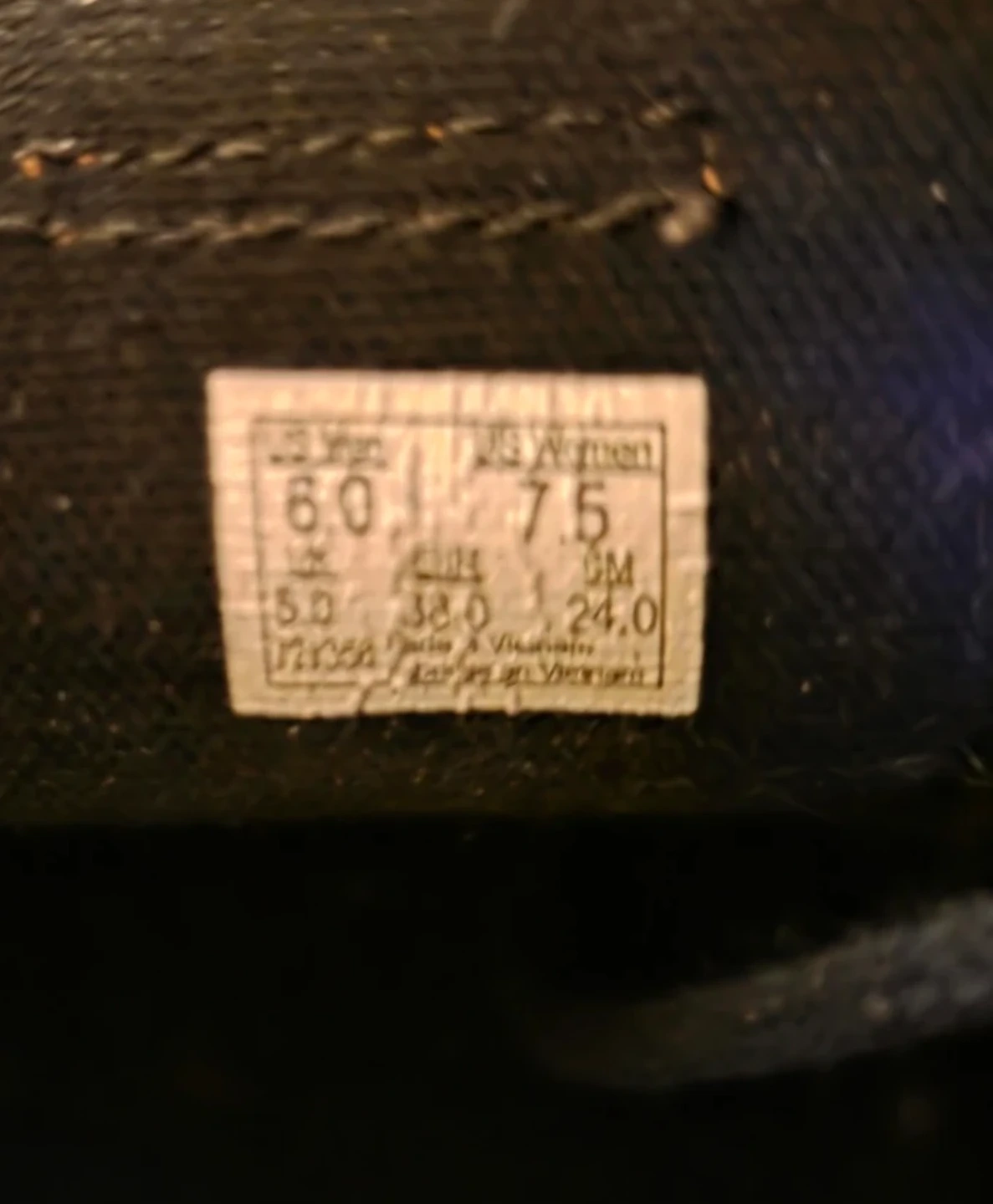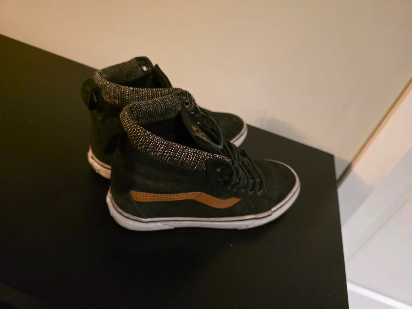 These are black Vans high-top sneakers with a brown stripe detail. They're a women's size 7.5, with a US Men's size 6.0 equivalent.