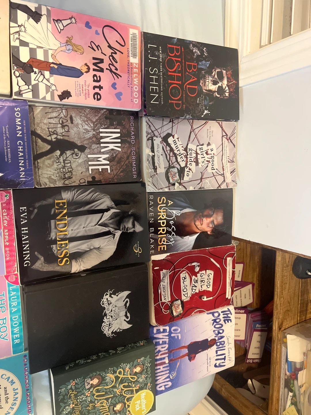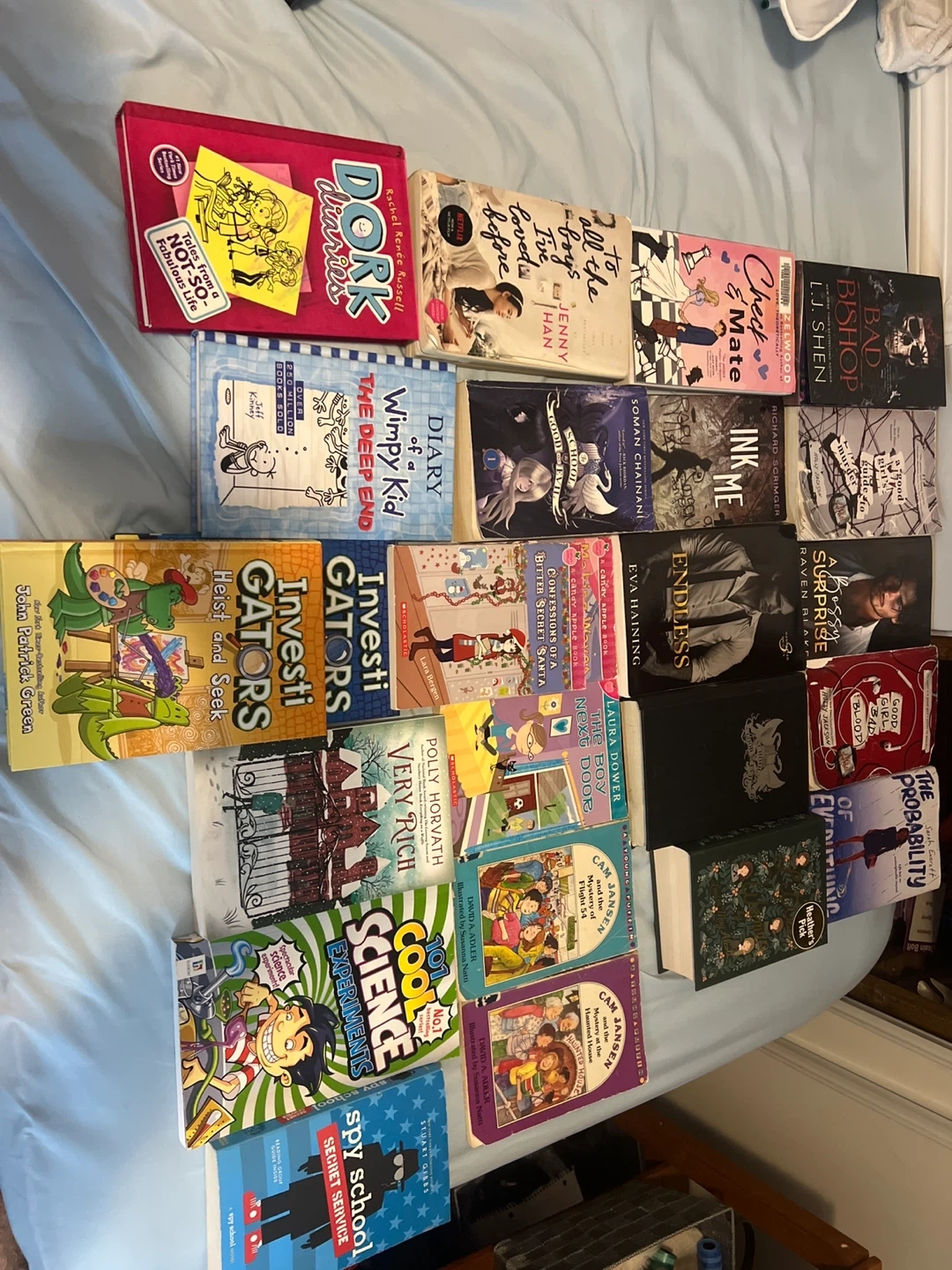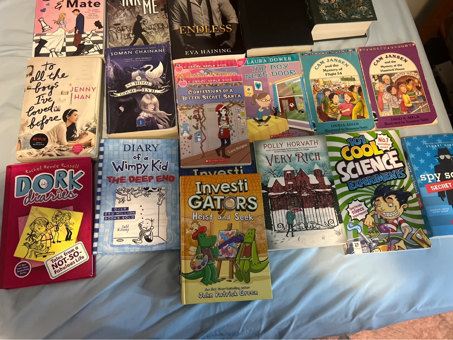 A diverse collection of books including YA novels, graphic novels, and children's stories. Titles range from fantasy and mystery to realistic fiction, offering something for every reader. Includes popular series like Dork Diaries and Diary of a Wimpy Kid. Some are never even touched you can also buy any of them