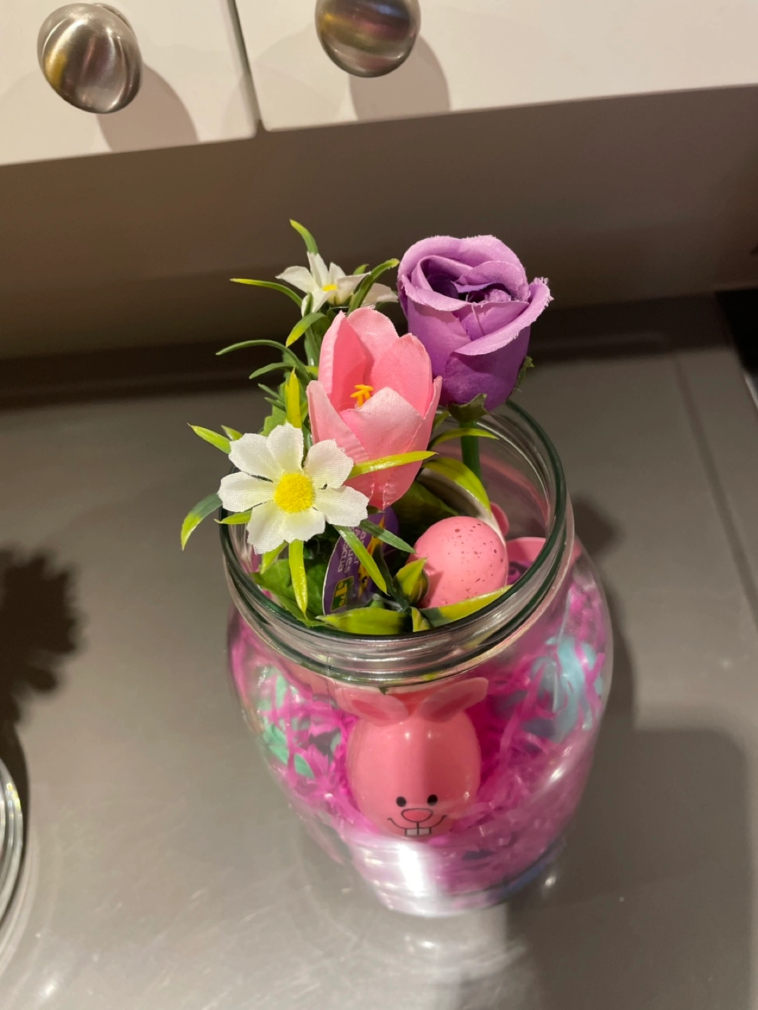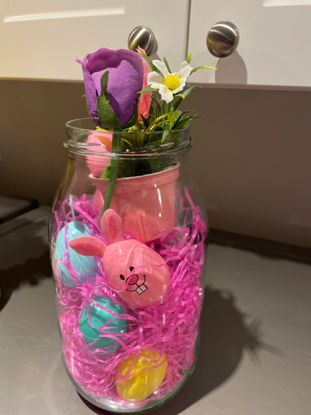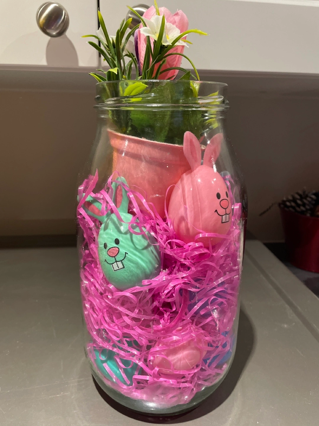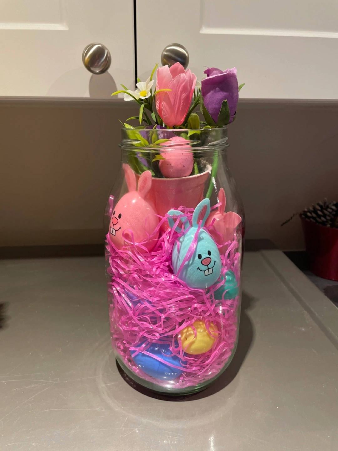 Adorable Easter decoration. Glass jar filled with pink shredded paper, pastel eggs, and bunny-shaped eggs. Artificial flowers added for a touch of spring. Perfect for Easter tablescape.