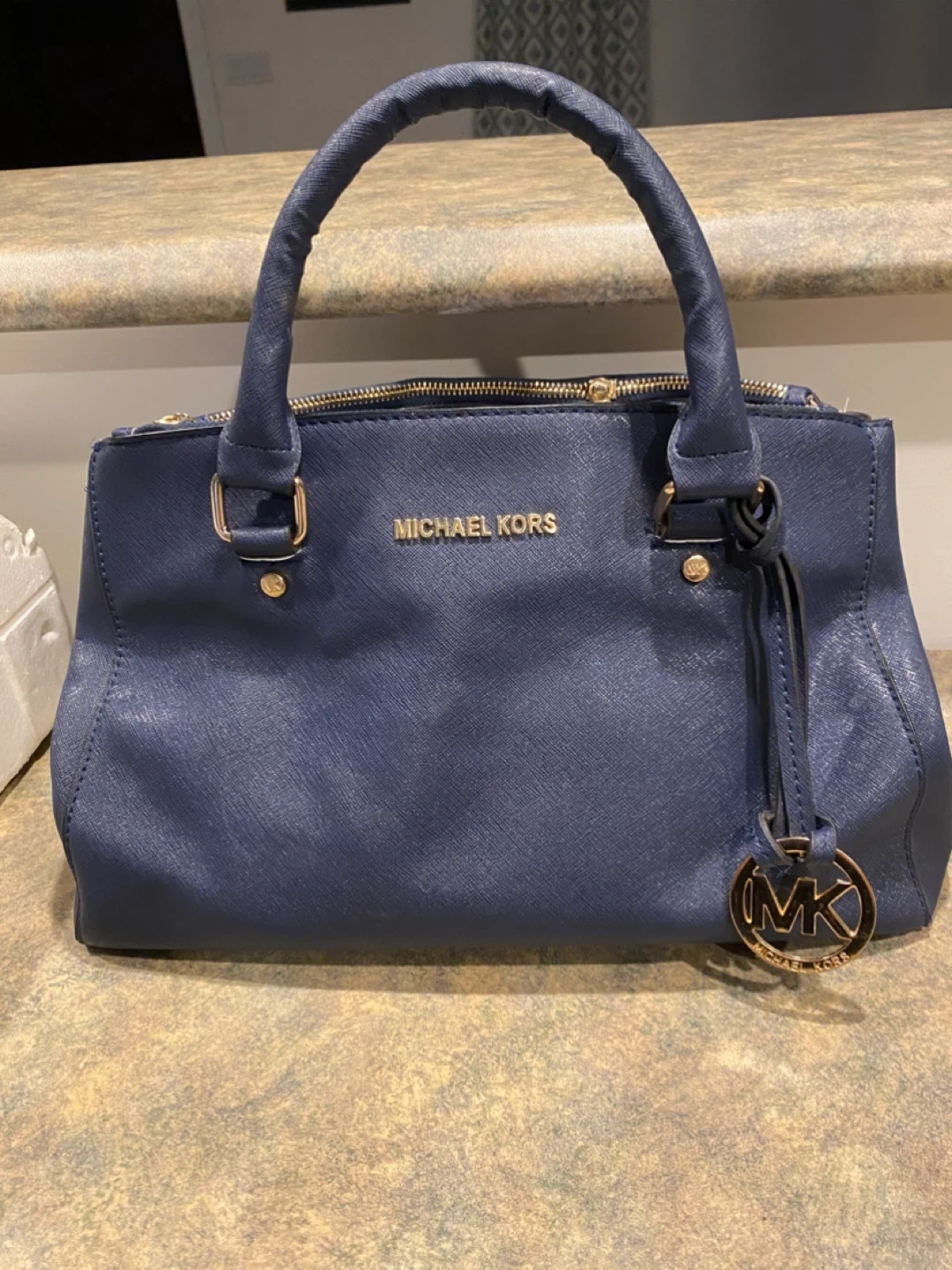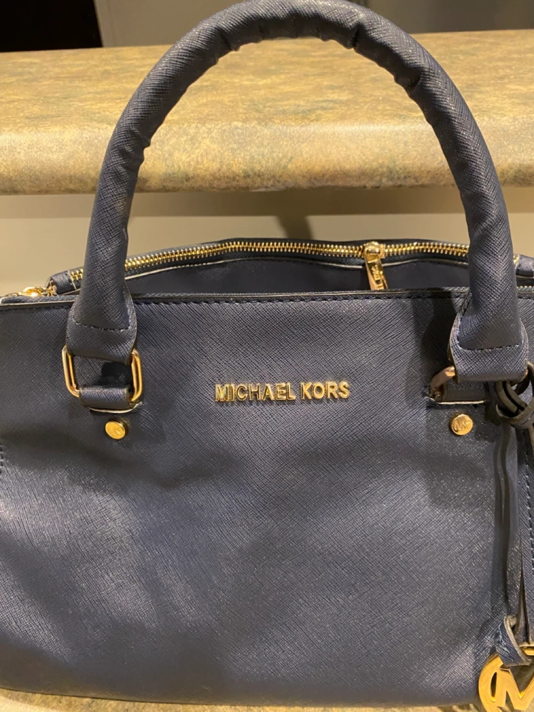 This Michael Kors satchel handbag is made of navy blue Saffiano leather. It features gold-tone hardware and a top zip closure. The bag has a hangtag with the MK logo.