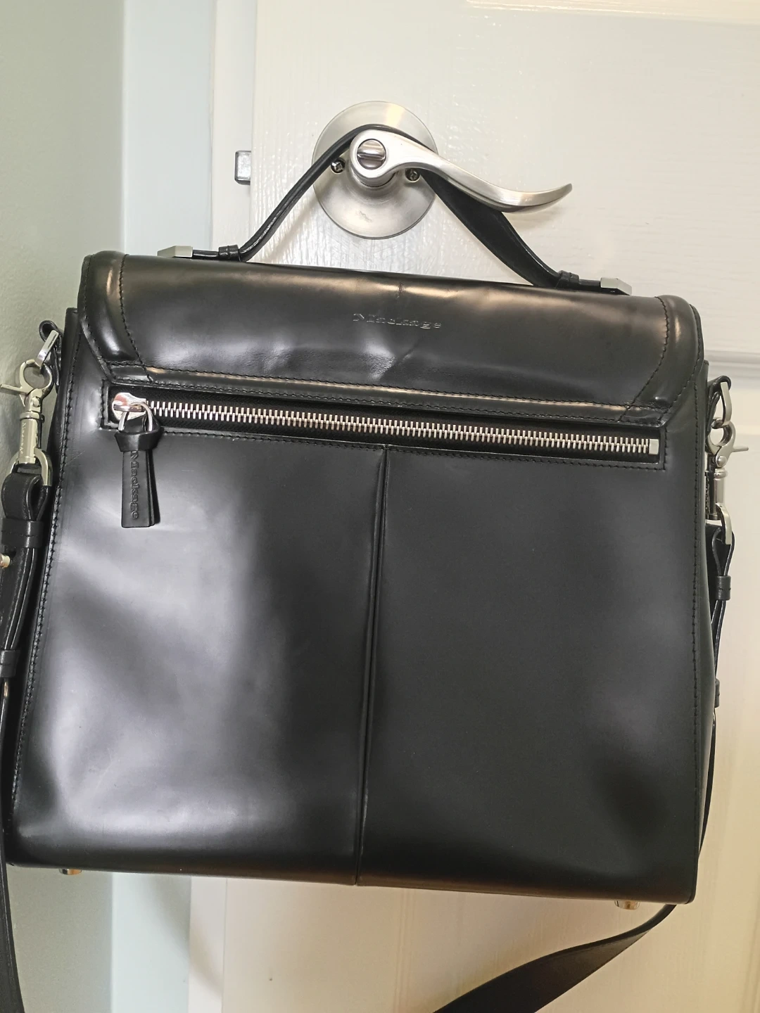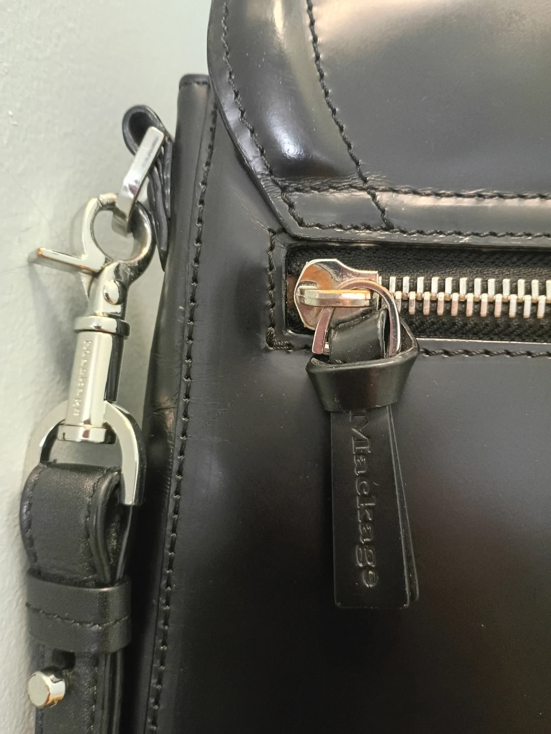 This is a stylish Mackage handbag, made from a combination of smooth black leather and textured suede. It's a versatile accessory that can be carried by the top handle or with the detachable shoulder strap. The bag features a zippered pocket and a main compartment for your essentials.