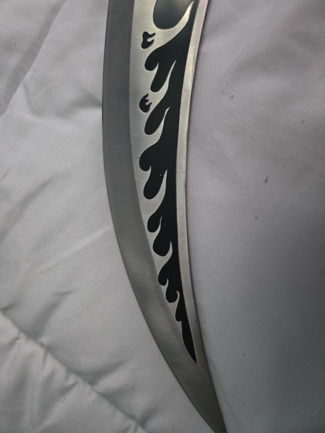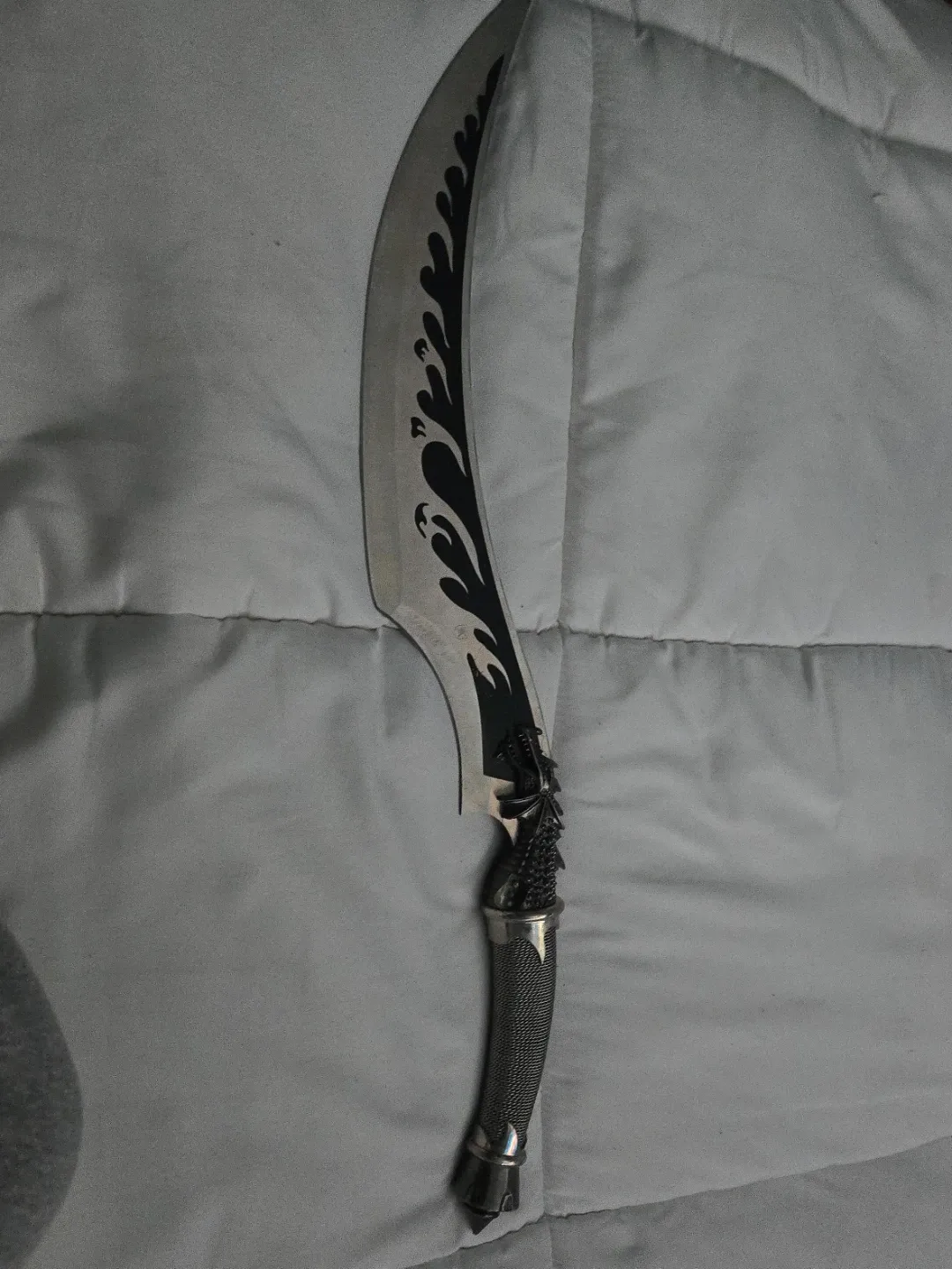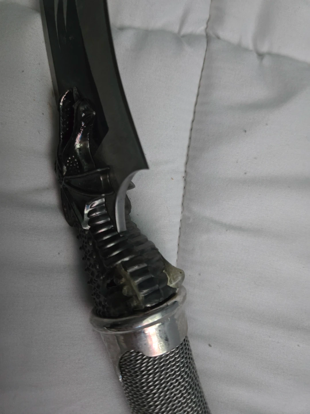 This knife features a unique dragon head handle design with a stainless steel blade. It has a curved blade with flame-like detailing. Its distinctive handle has a mesh-like texture and silver-tone accents.
