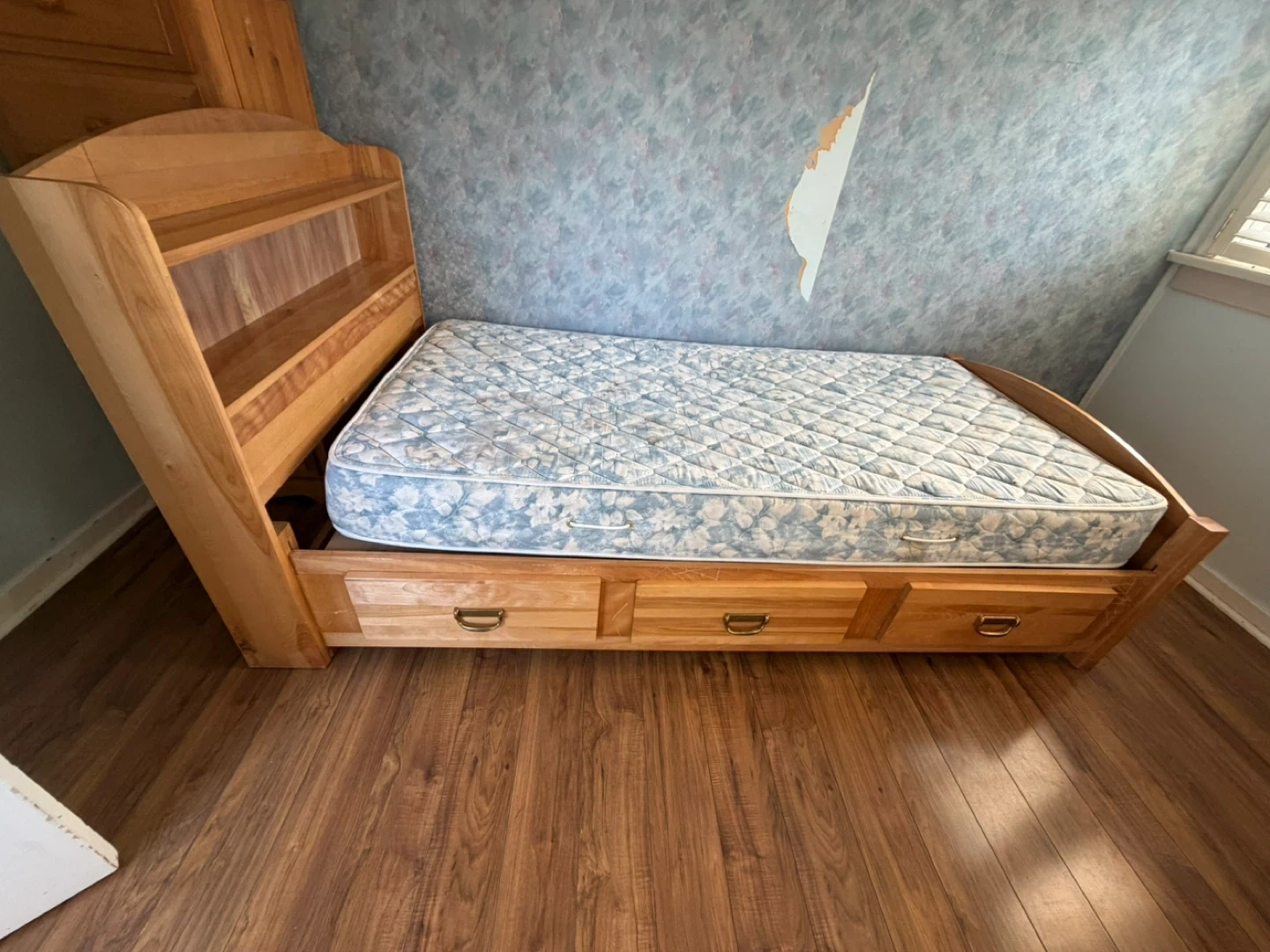 Solid wood twin daybed featuring a bookshelf headboard and three storage drawers. The mattress has a blue floral pattern. It's perfect for a child's room or guest space!