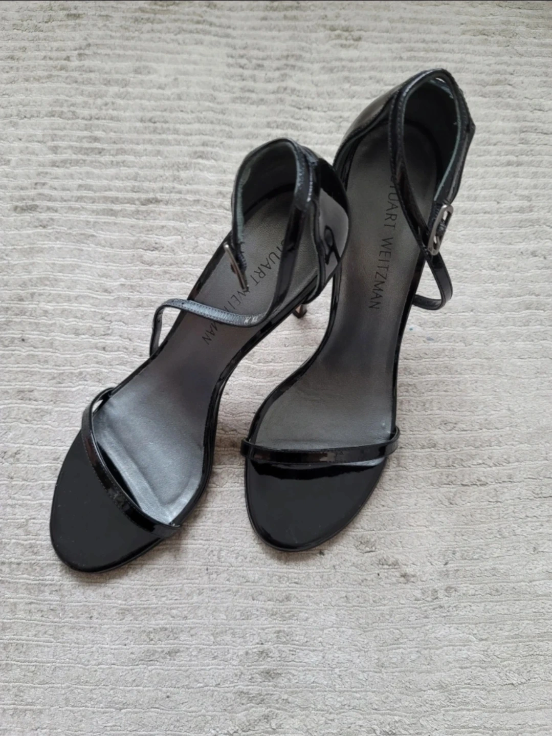 These are black patent leather ankle strap heels from Stuart Weitzman. They feature a slim stiletto heel and a delicate strap design. The material is patent leather.