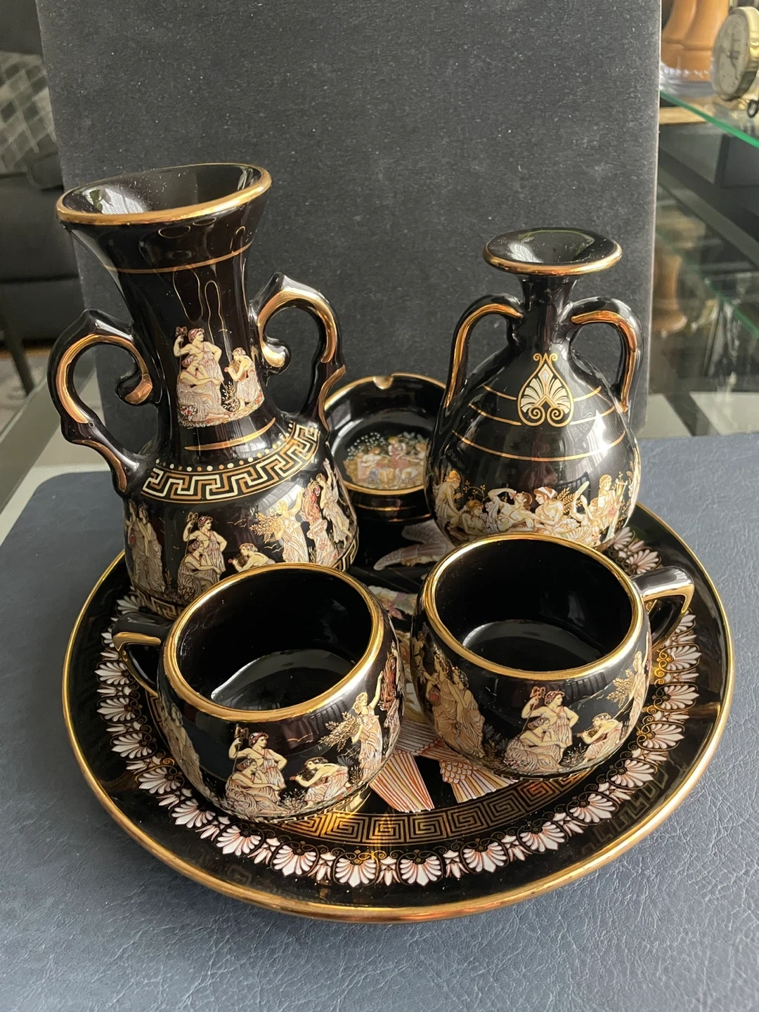 New, never used vintage set includes two black coffee ceramic cups, serving platter 9.5” diameter, two amphora vases and an ashtray.