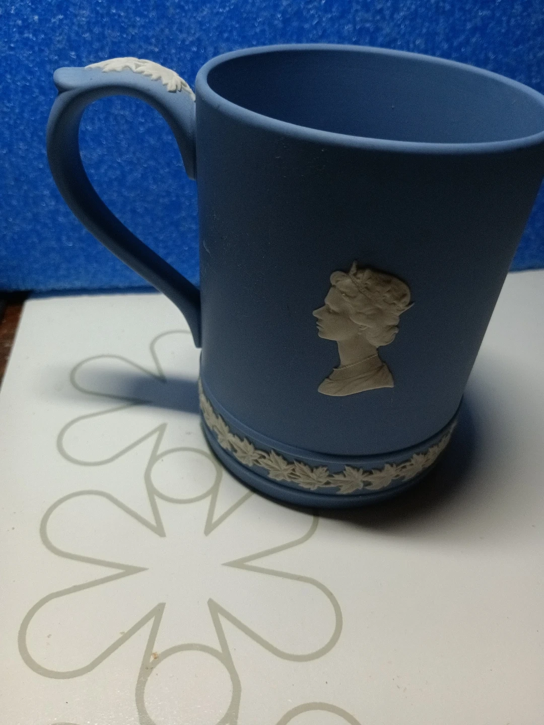 This is a Wedgwood Jasperware mug commemorating the Canadian Constitution in 1982. It features a profile of Queen Elizabeth II and the Canadian Coat of Arms. Made of fine stoneware.