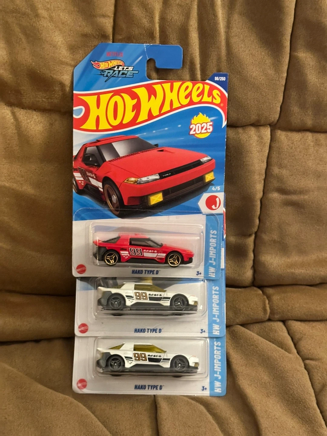 Here are three Hot Wheels Hako Type D toy cars. Two are white and one is red. They're in their original packaging.