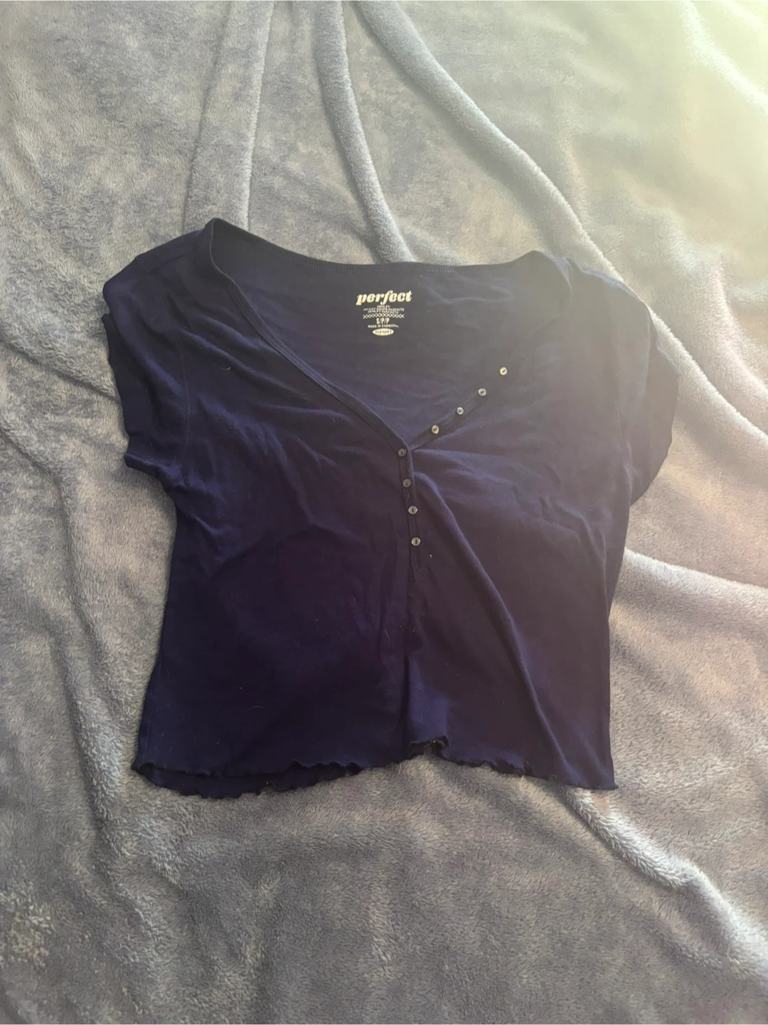 This is a blue Henley shirt from Old Navy. It's a size S/P. The shirt has a V-neck with button closure and a lettuce hem.
