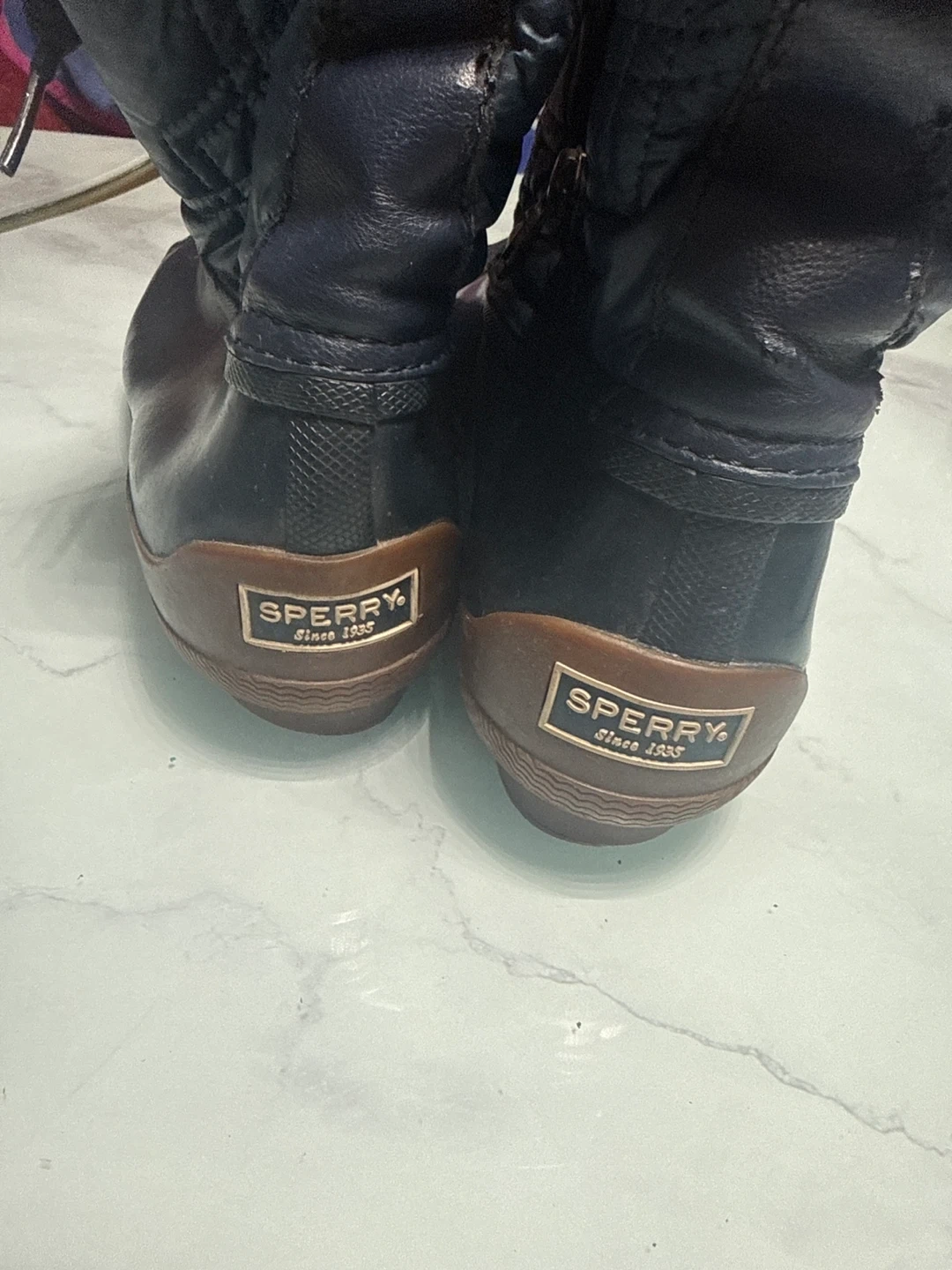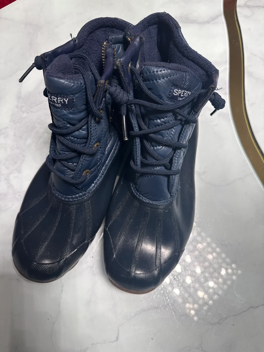 Sperry waterproof rubber boots in navy blue. Women's size 8.5. These boots are designed for wet weather. Features a side zipper and lace-up front.