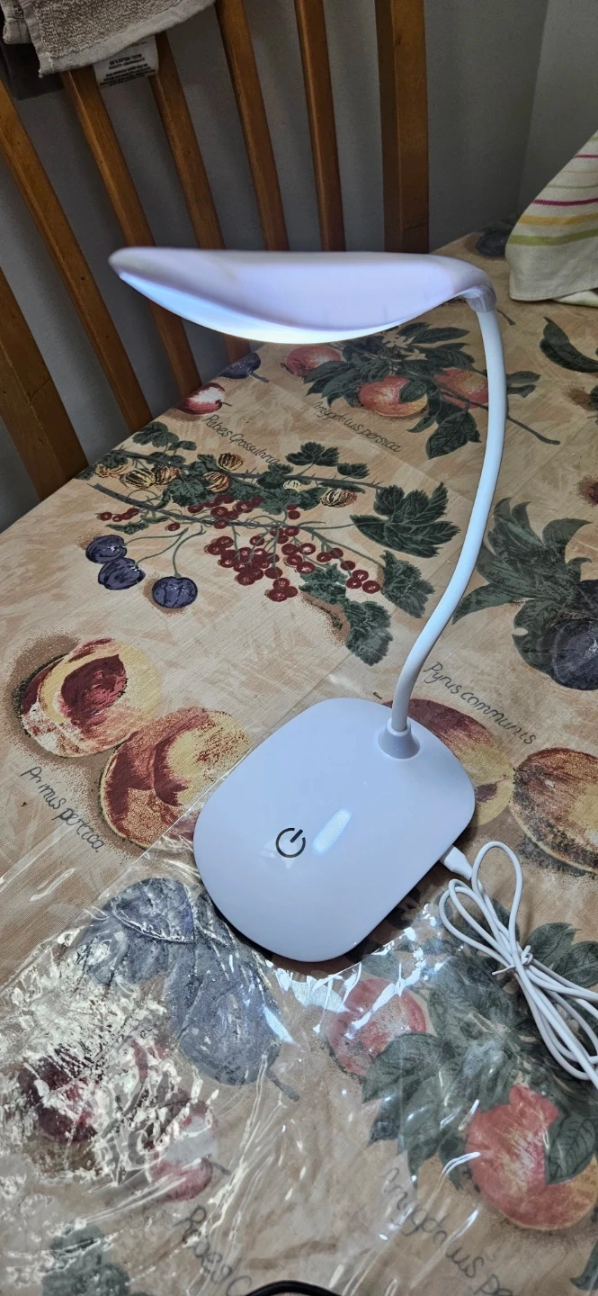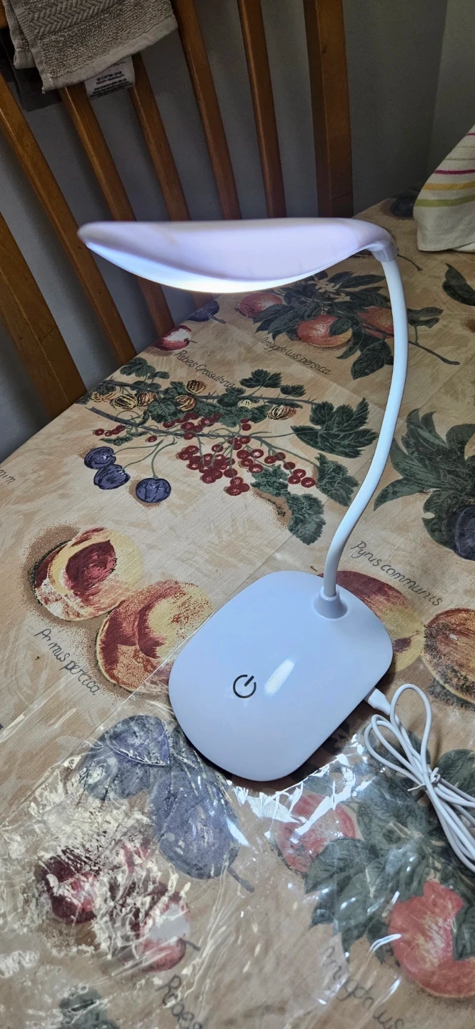 This is a white LED desk lamp with a flexible gooseneck design. It's powered by a USB cable and features a touch-sensitive power button. Its slim profile makes it easy to place on any desk.Has three levels of light beam adjustment.