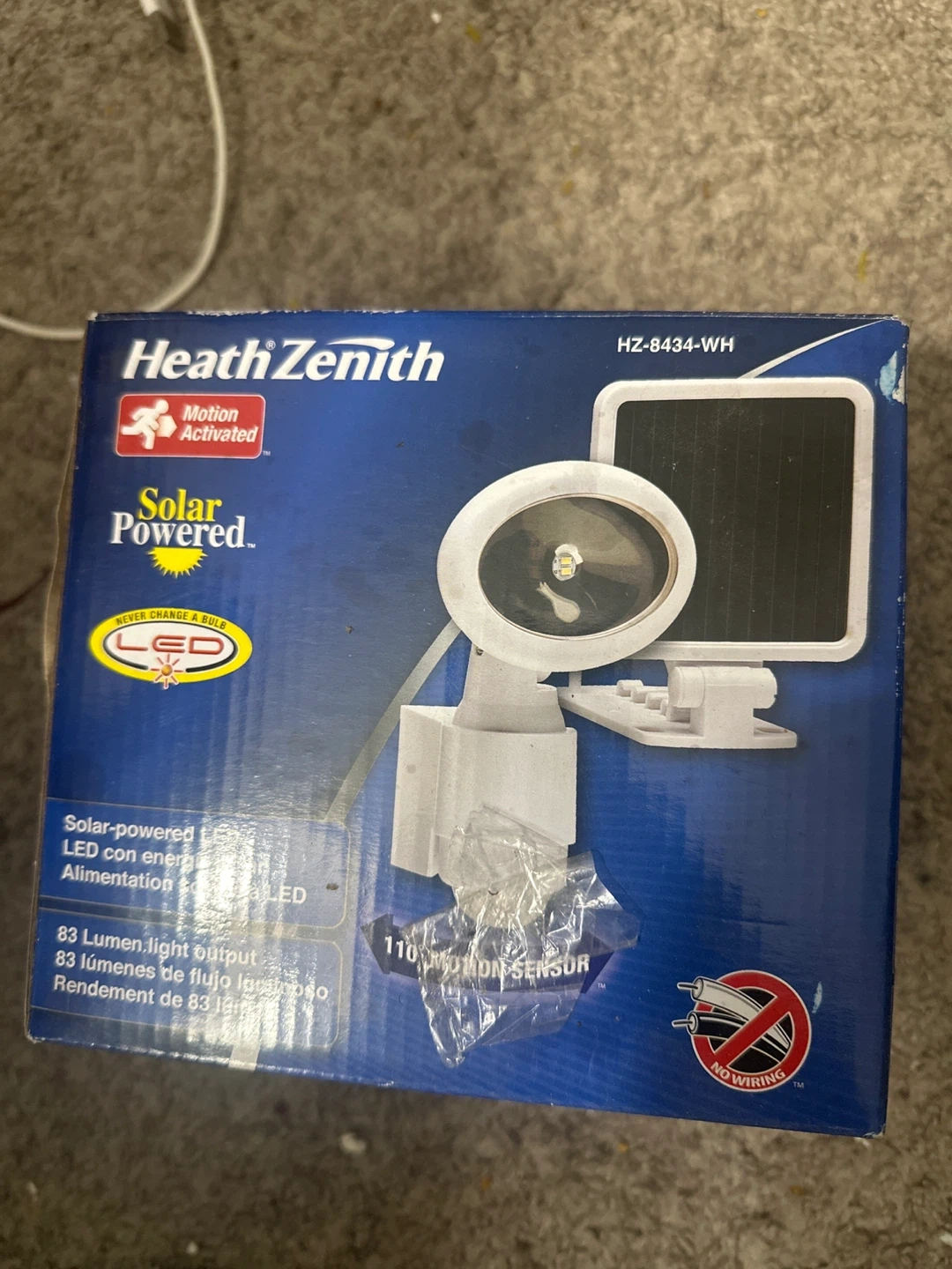 Selling a Heath Zenith solar-powered light, model HZ-8434-WH. It's motion activated and has an LED light that never needs changing. The light outputs 83 lumens and requires no wiring.