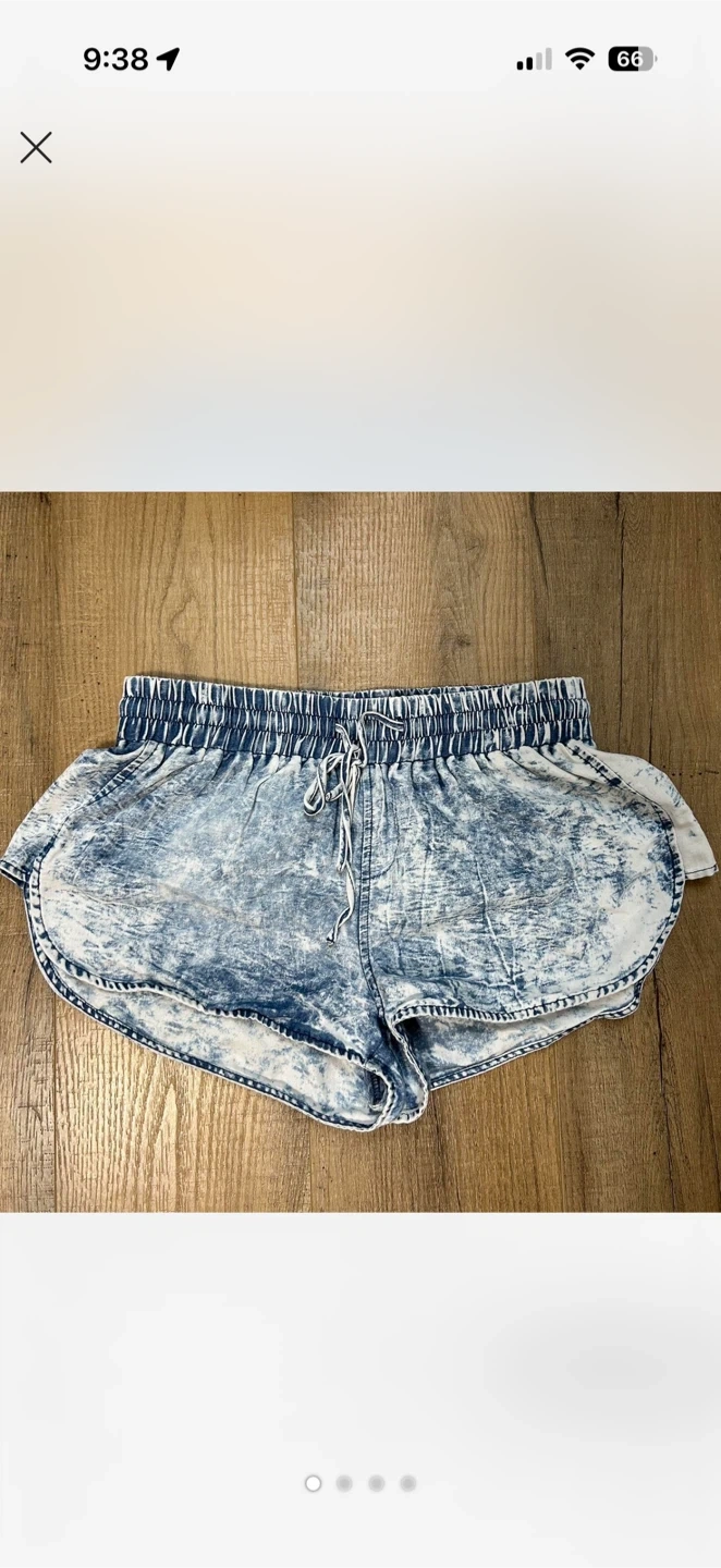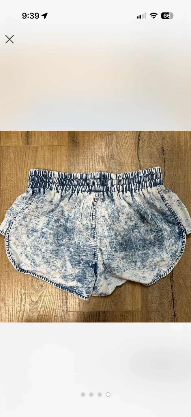 Comfortable dolphin shorts with an acid wash blue and white pattern. Features a drawstring waist and elastic waistband. Material is soft and lightweight, perfect for casual wear or lounging. Size is Medium but fits more like an XS