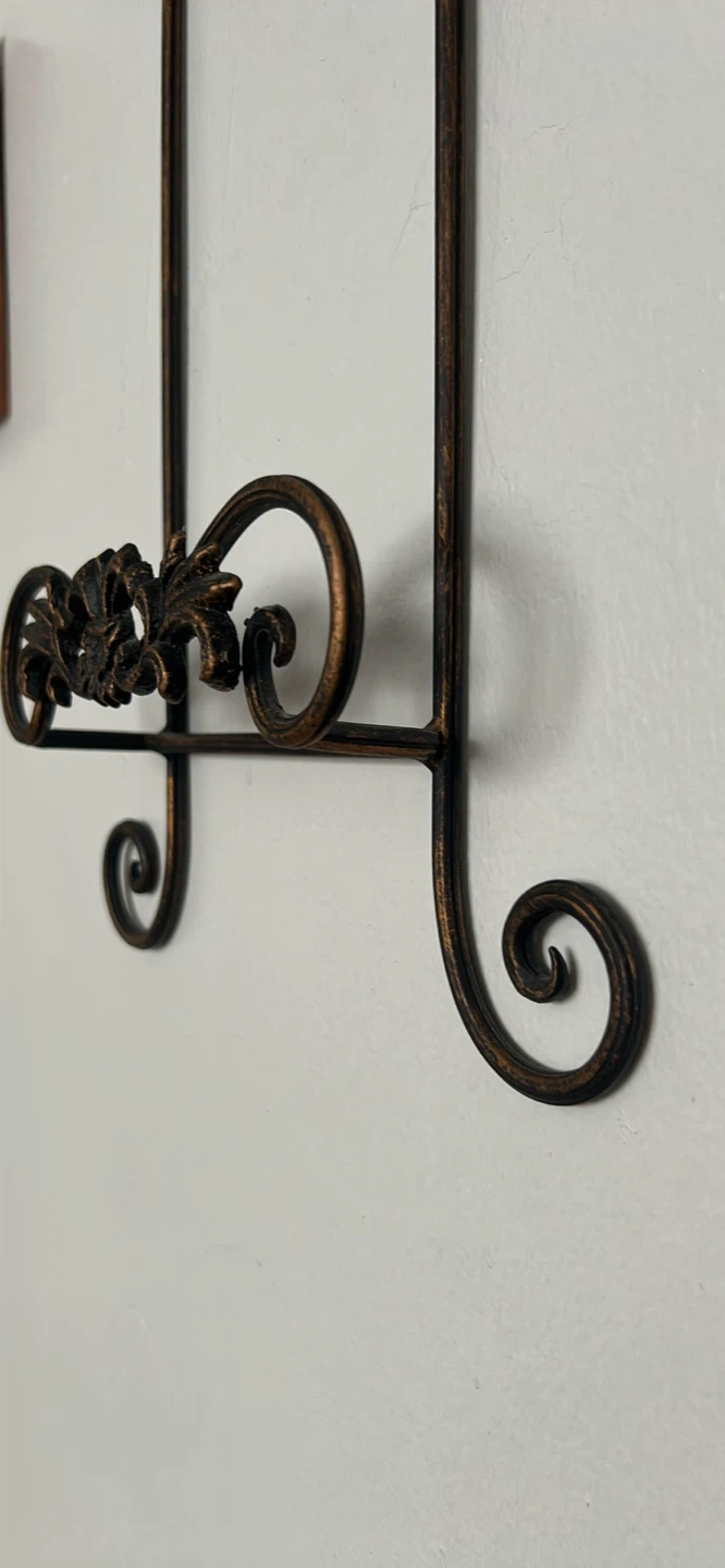 This is a decorative metal easel with an ornate scroll design. It's a bronze colour and stands about 19 inches tall. It's suitable for displaying small pictures or plates.