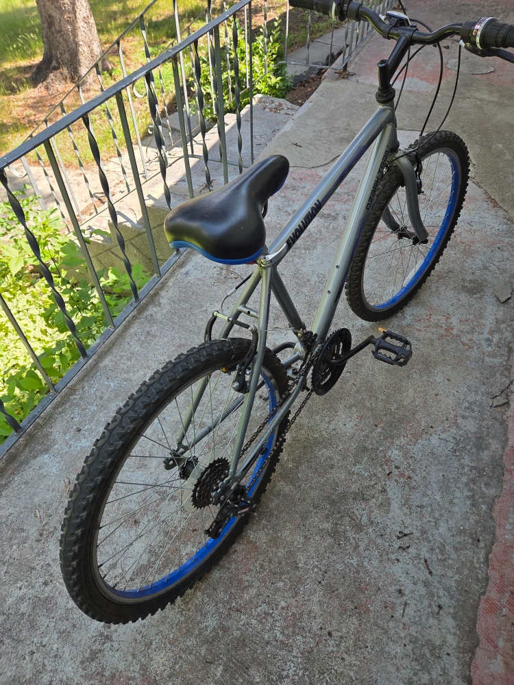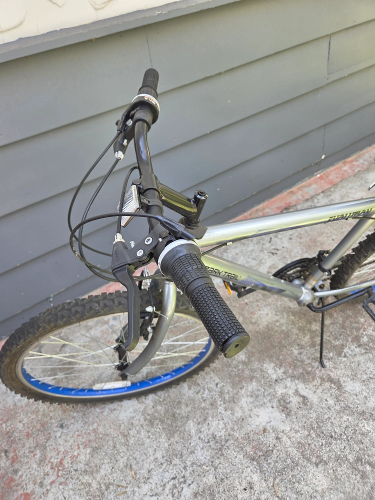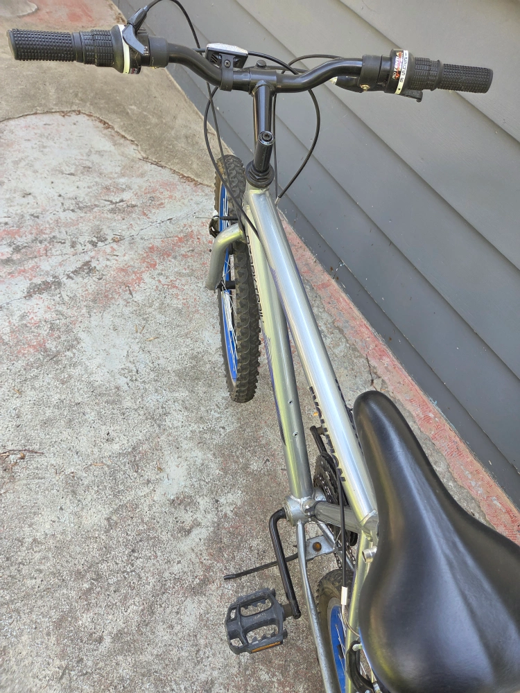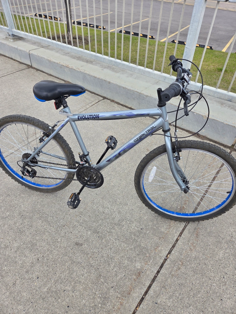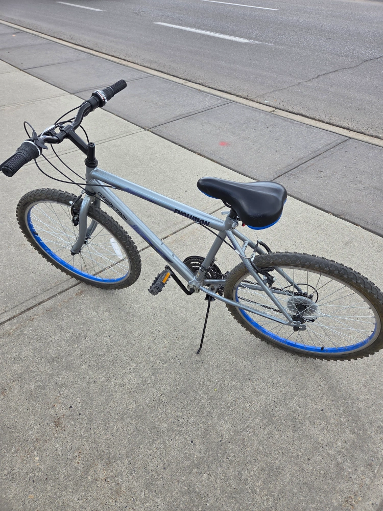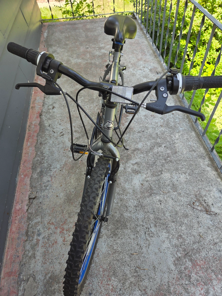 Men's mountain bike. Grey frame, blue accents. 26 inch wheels. Used condition. Needs cleaning. you need to replace some parts(flat tires, rear gear shift broken) Even though you replace those parts, the cost is still cheaper than new one. And if you don't care, just fill only flat tires with wind. Then go ride the bike.