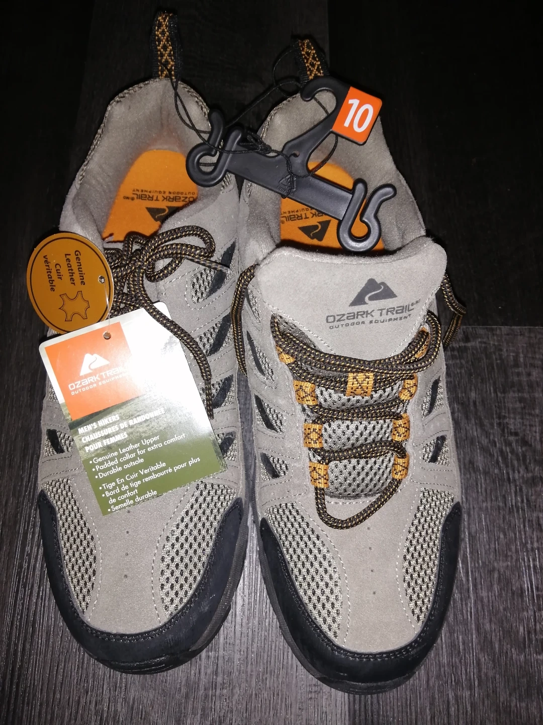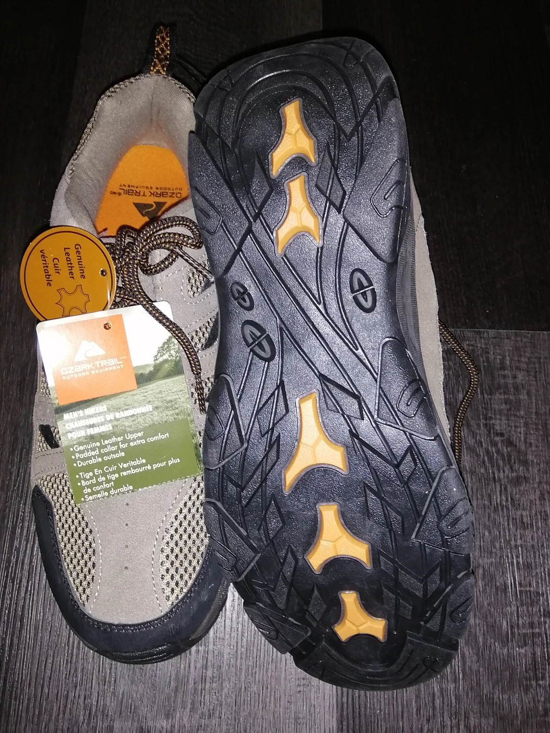 12These Ozark Trail men's hiking shoes are brand new with tags! They feature a genuine leather upper and a padded collar for extra comfort. The soles are durable and ready for the trails. Size 10. Excellent shoes but now half size too small.
