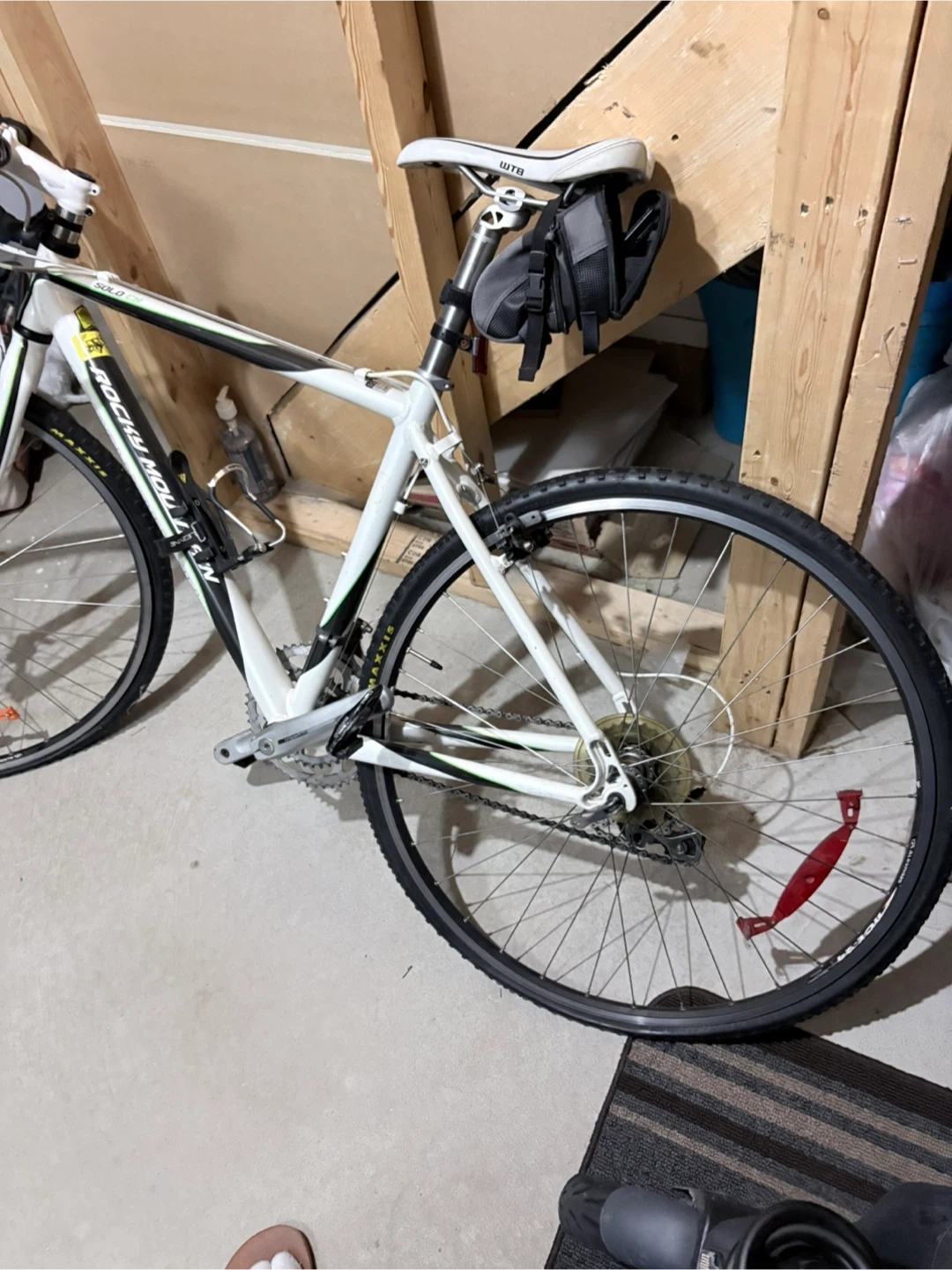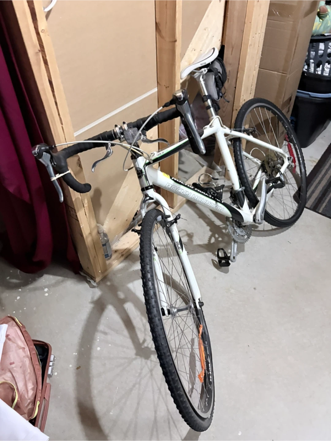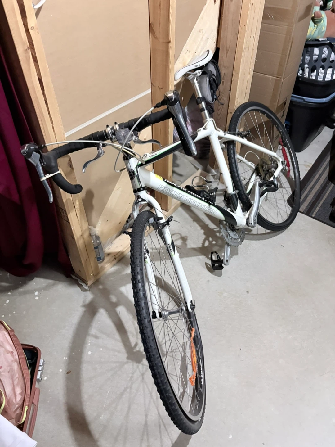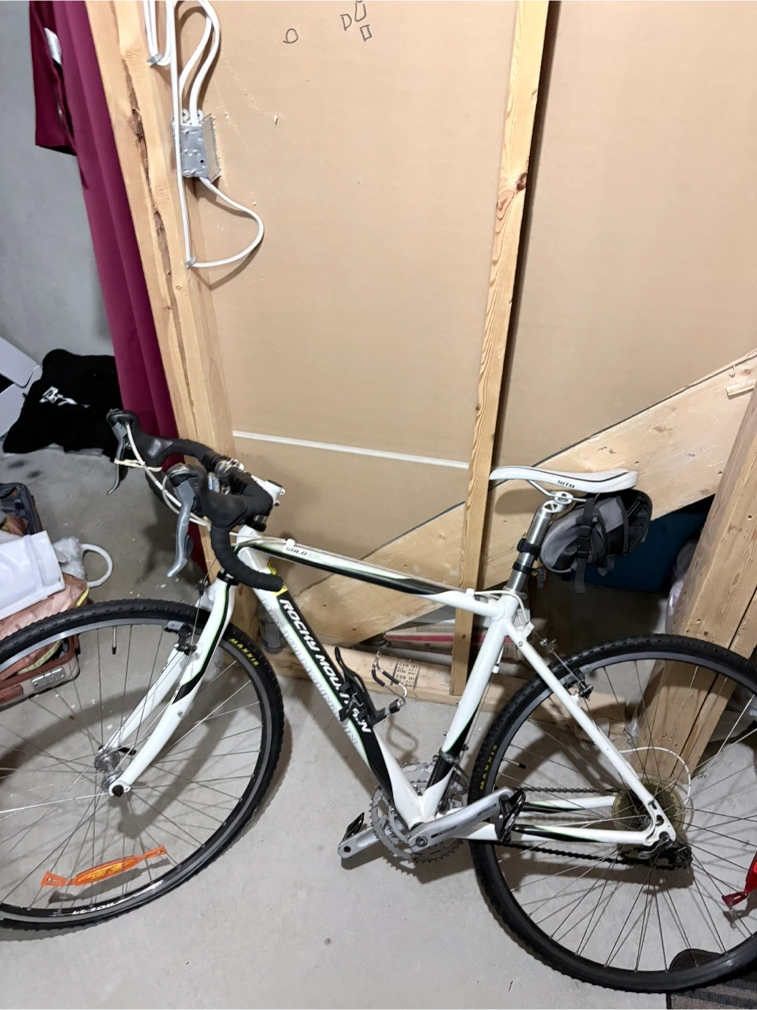 White Rocky Mountain Solo CX road bike with drop handlebars. It's equipped with WTB saddle and Maxxis tires. This bike's great for commuting or light trail riding!