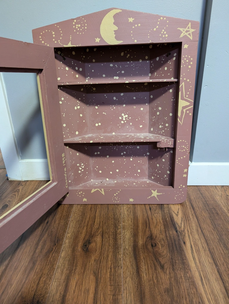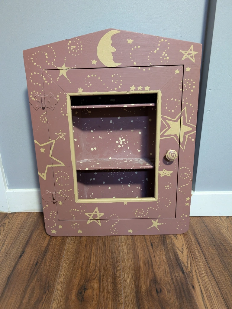 Small wooden cabinet with door. painted with a moon and stars design. Two shelves inside. Can be good for a medicine cabinet, corner cabinet or art project and paint it yourself !