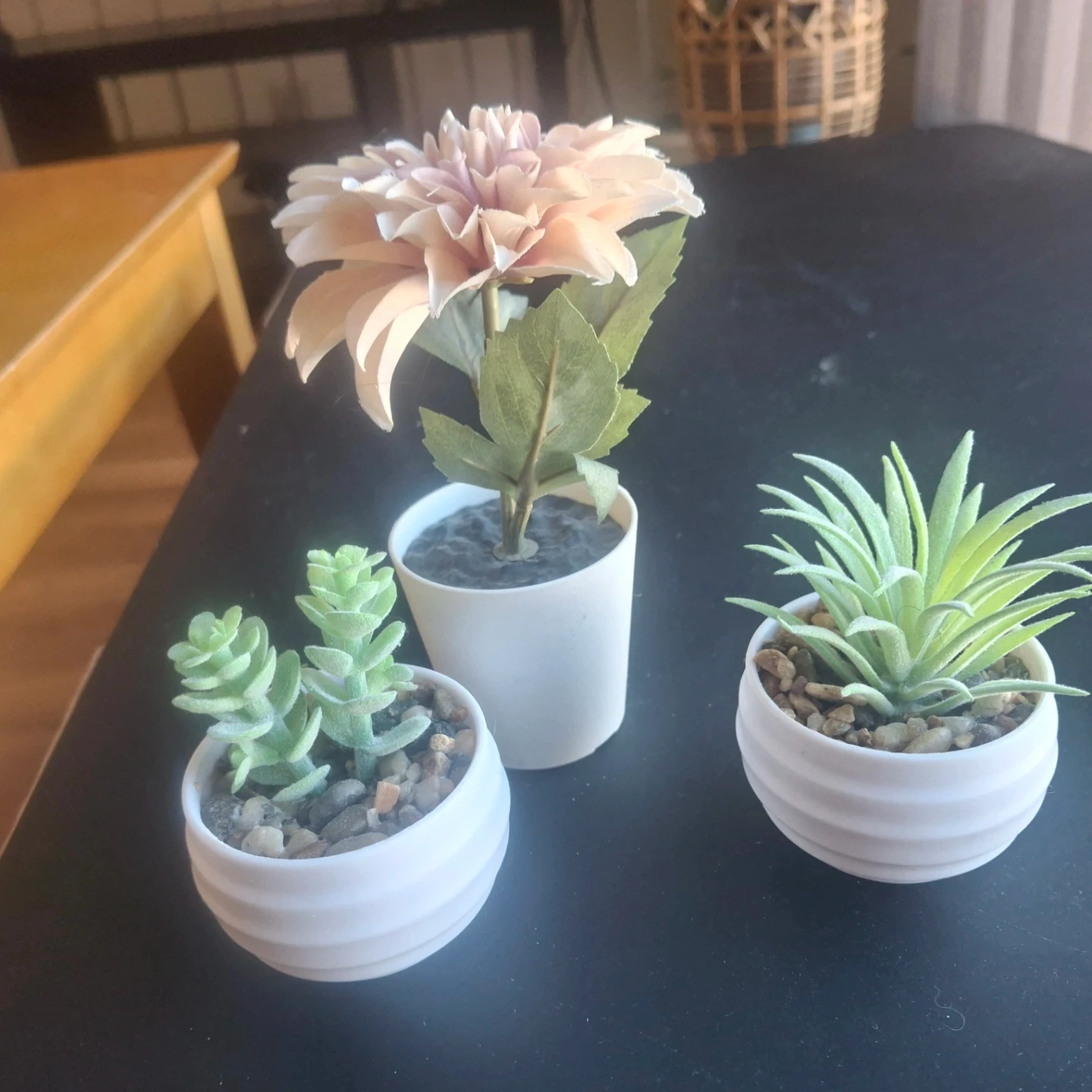 Three artificial plants in white decorative pots. Includes a large blush-pink flower, a small succulent, and a green spiky plant. Great for adding a touch of greenery without the maintenance!