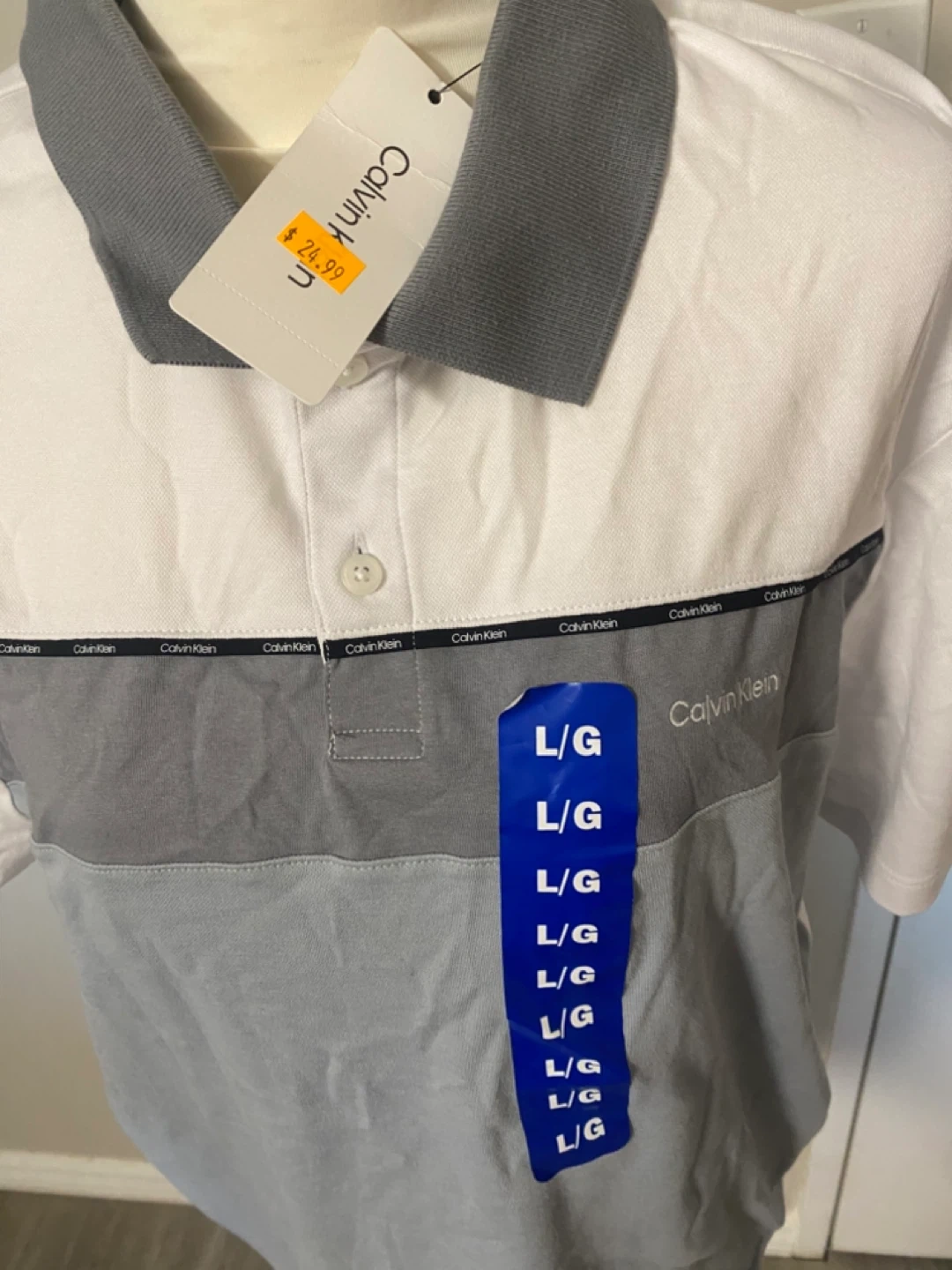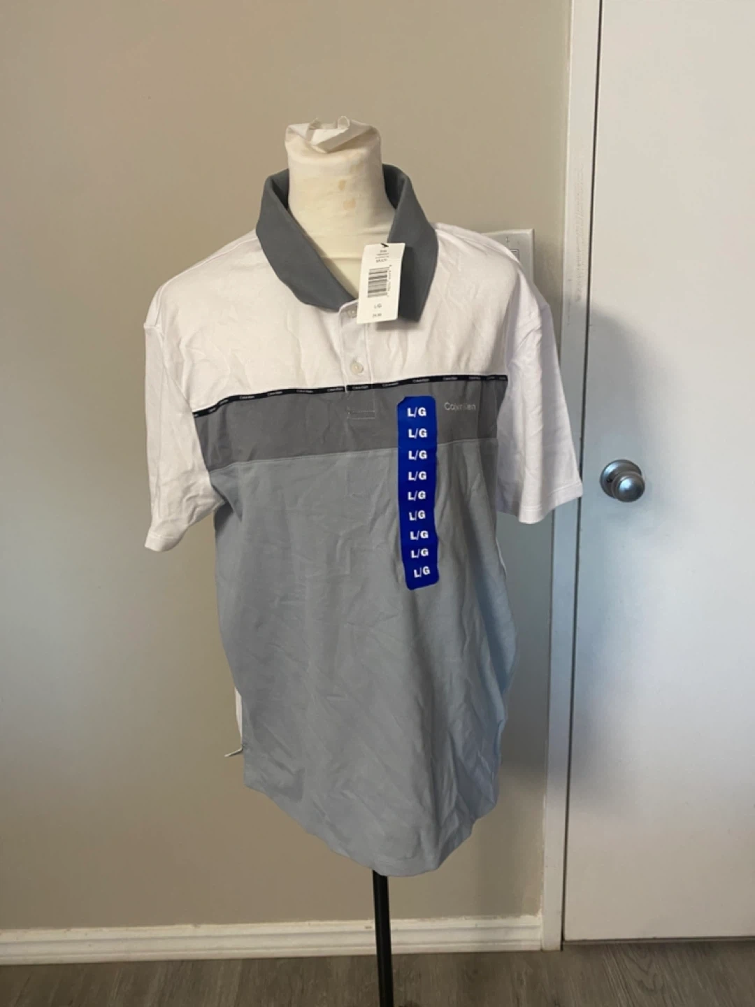 Brand new Calvin Klein men's polo shirt in size Large. It's a stylish color block design with white, grey, and a darker grey accent. The shirt features the Calvin Klein logo on the collar tag and along the chest band.