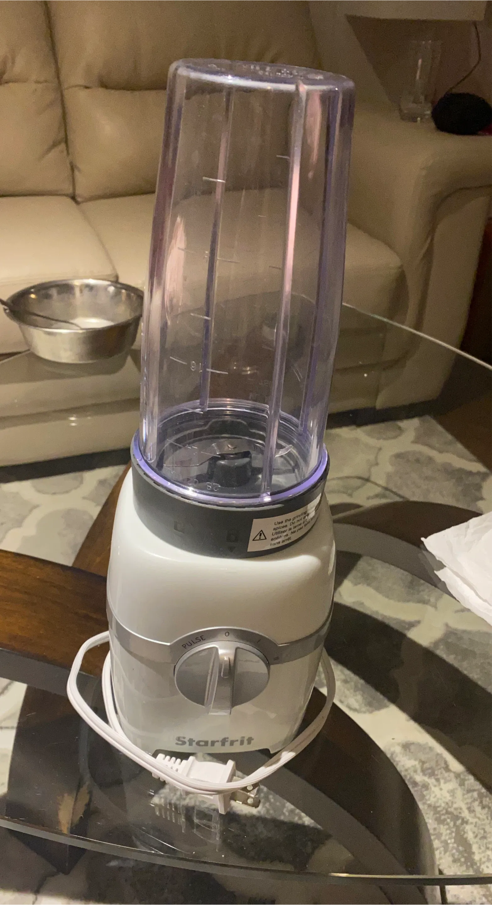 This Starfrit personal blender is white and comes with a clear blending cup. It has a pulse function and is great for making smoothies or crushing small ingredients. The cup is made of durable plastic.