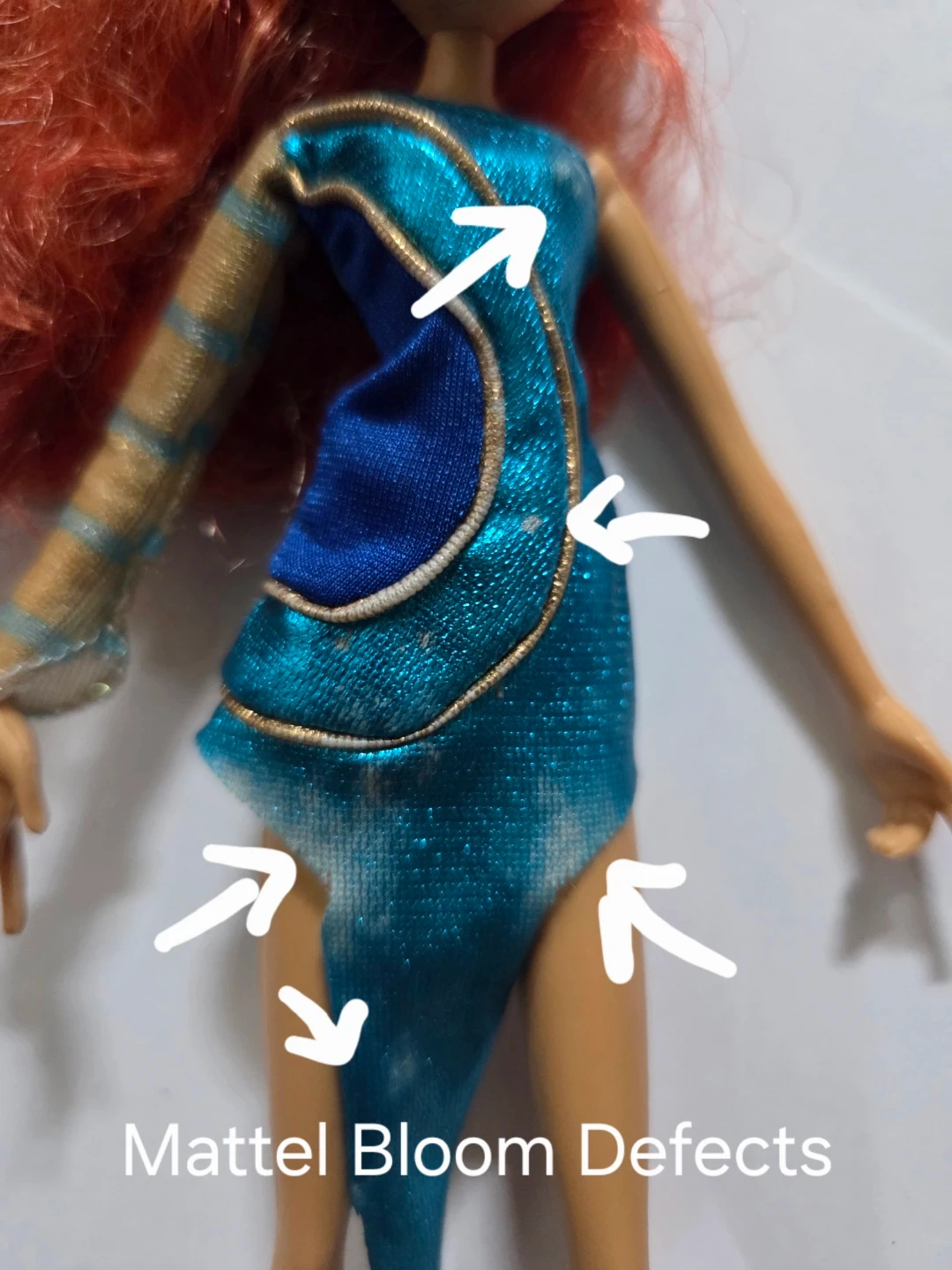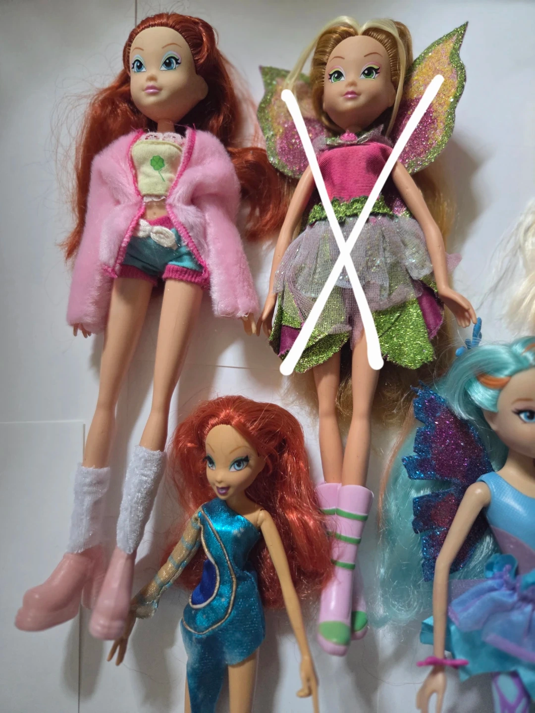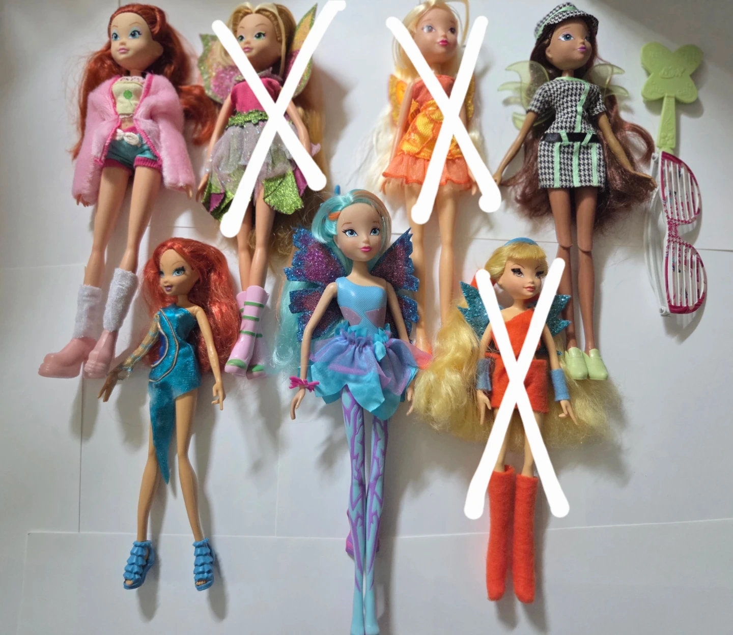 -Mattel Stella ( She's wearing a handmade outfit- top, shorts, boots, hairpieces and wrist pieces made from felt. The headband is 3D printed and painted. Wings are made of felt and has glitter with a magnet. Her hands have defects - see pic) - SOLD