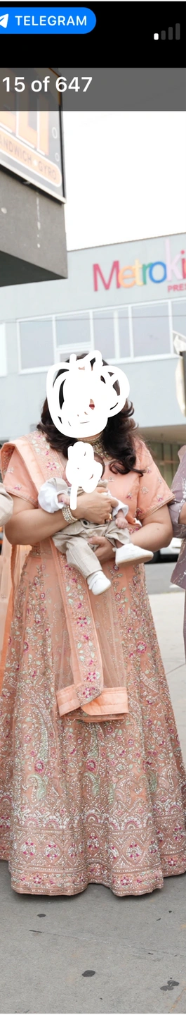 Stunning peach embroidered lehenga set. Features intricate beadwork and embroidery throughout the skirt and blouse. Sheer dupatta included. Perfect for special occasions!