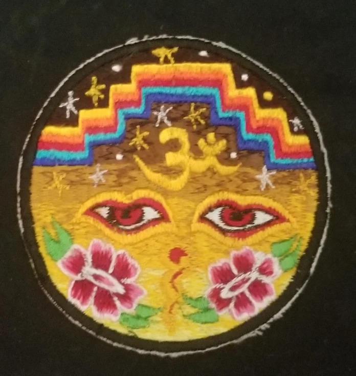 This is a unique embroidered patch featuring a blend of floral and celestial designs. It has vibrant colours and intricate detailing. It would be a great addition to any jacket, bag, or craft project!