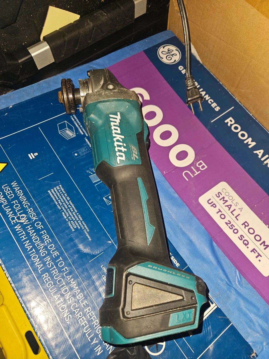 This is a Makita LXT cordless angle grinder with a brushless motor. It's powered by an LXT battery. This tool is designed for cutting and grinding applications.