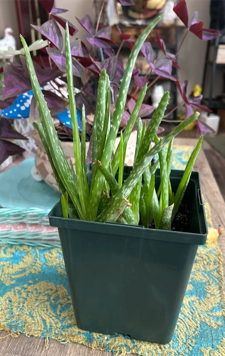 Healthy aloe vera plant with several pups. It's in a dark green plastic pot with soil. This plant is known for its soothing properties.
